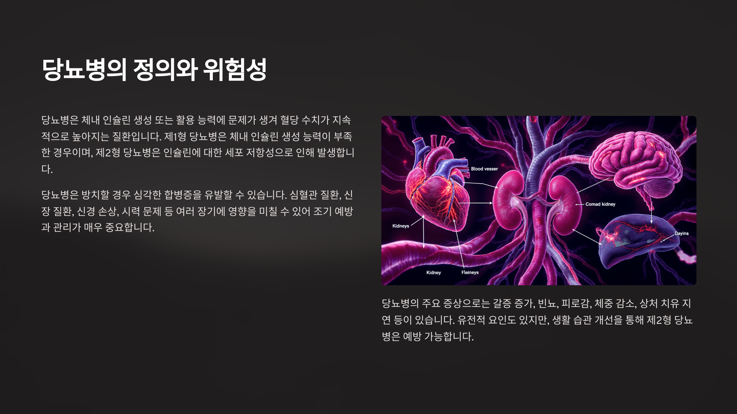 당뇨병은 인슐린이라는 호르몬의 분비가 부족하거나 제대로 작용하지 않아서 혈당이 비정상적으로 높아지는 상태를 말해요. 인슐린은 우리 몸이 섭취한 당분을 에너지로 전환시키는 역할을 하는데, 이 기능에 문제가 생기면 혈액 속에 당이 남게 되죠.