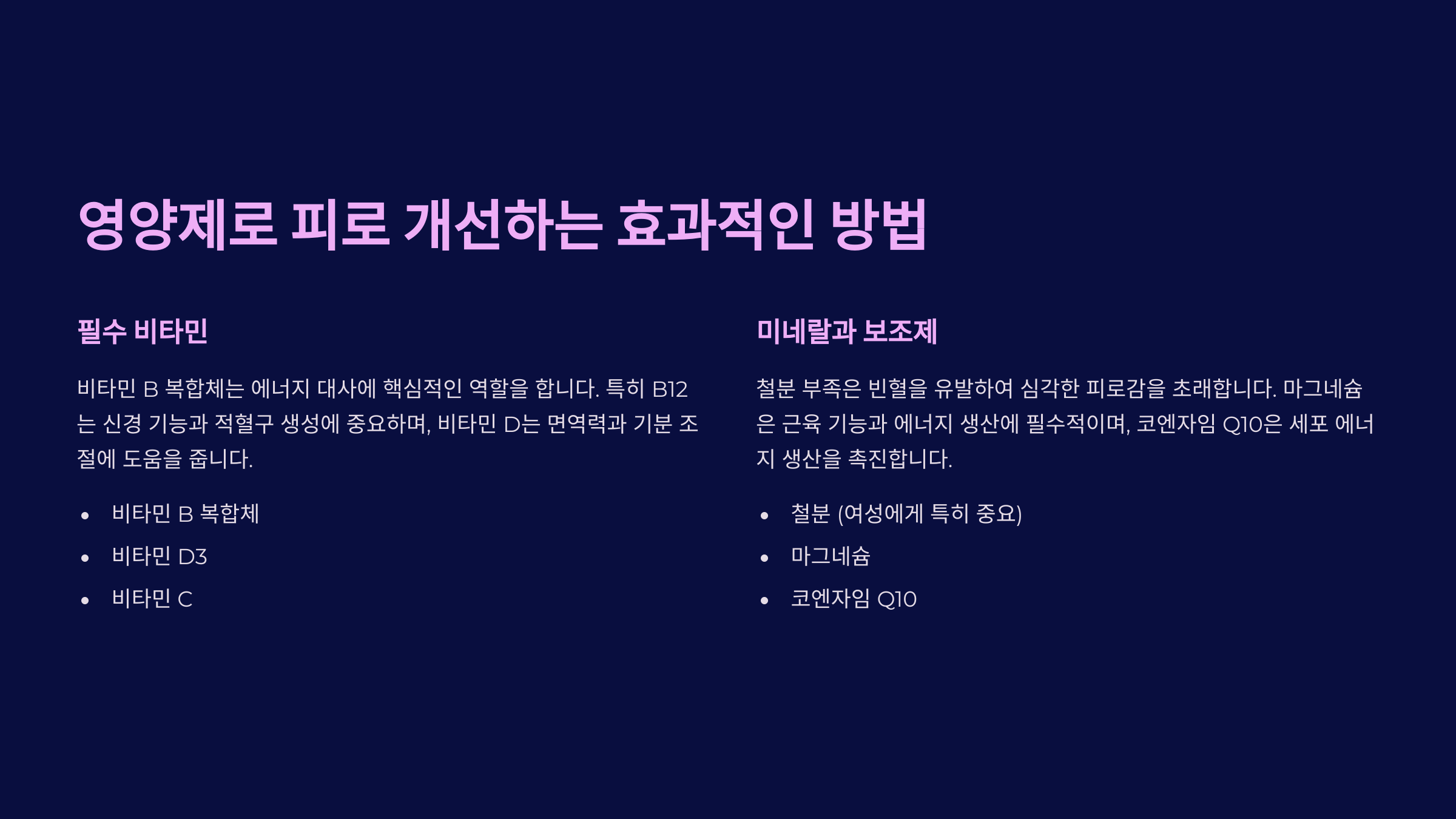 이외에도 만성적인 염증 상태, 혈당 불균형, 수면 장애, 철분 결핍이나 비타민 D 부족 같은 미세영양소 부족도 만성피로의 주요 원인 중 하나예요. 이런 문제들은 단독으로도 피로를 유발하지만 복합적으로 겹치면 훨씬 더 심각해져요.