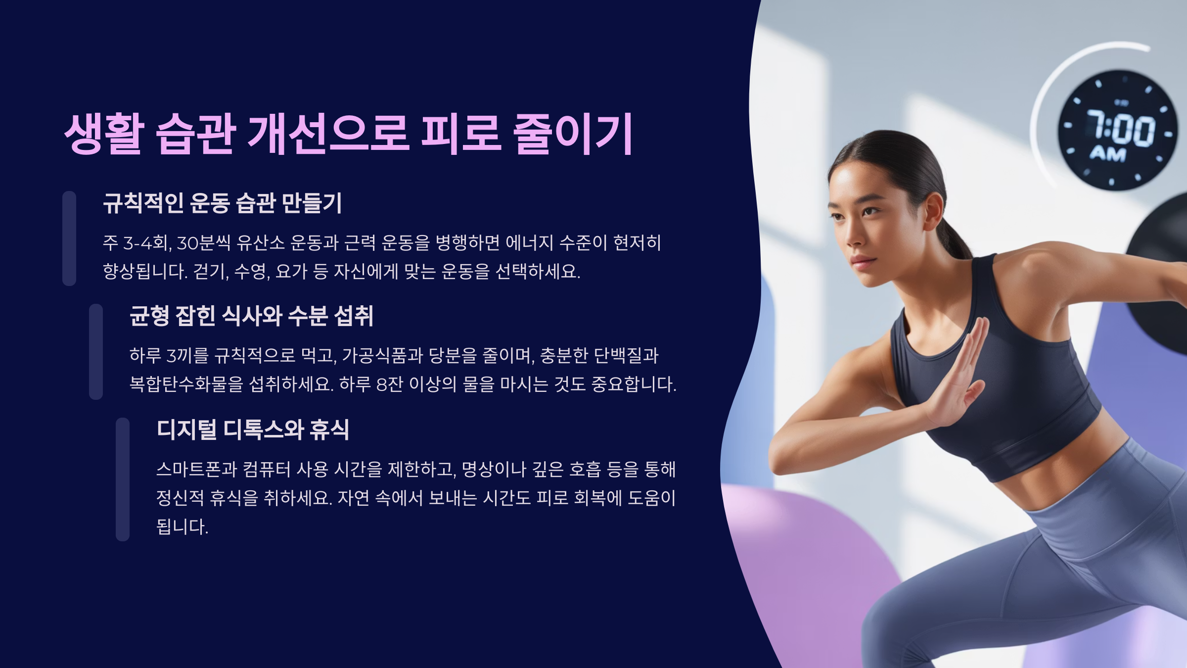 피로를 줄이는 가장 강력한 방법 중 하나는 바로 일상의 작은 습관을 바꾸는 거예요. 단기간에 효과를 기대하기보다는, 일상 속에서 에너지를 천천히 회복하는 방식이 오히려 장기적으로 훨씬 유리해요.