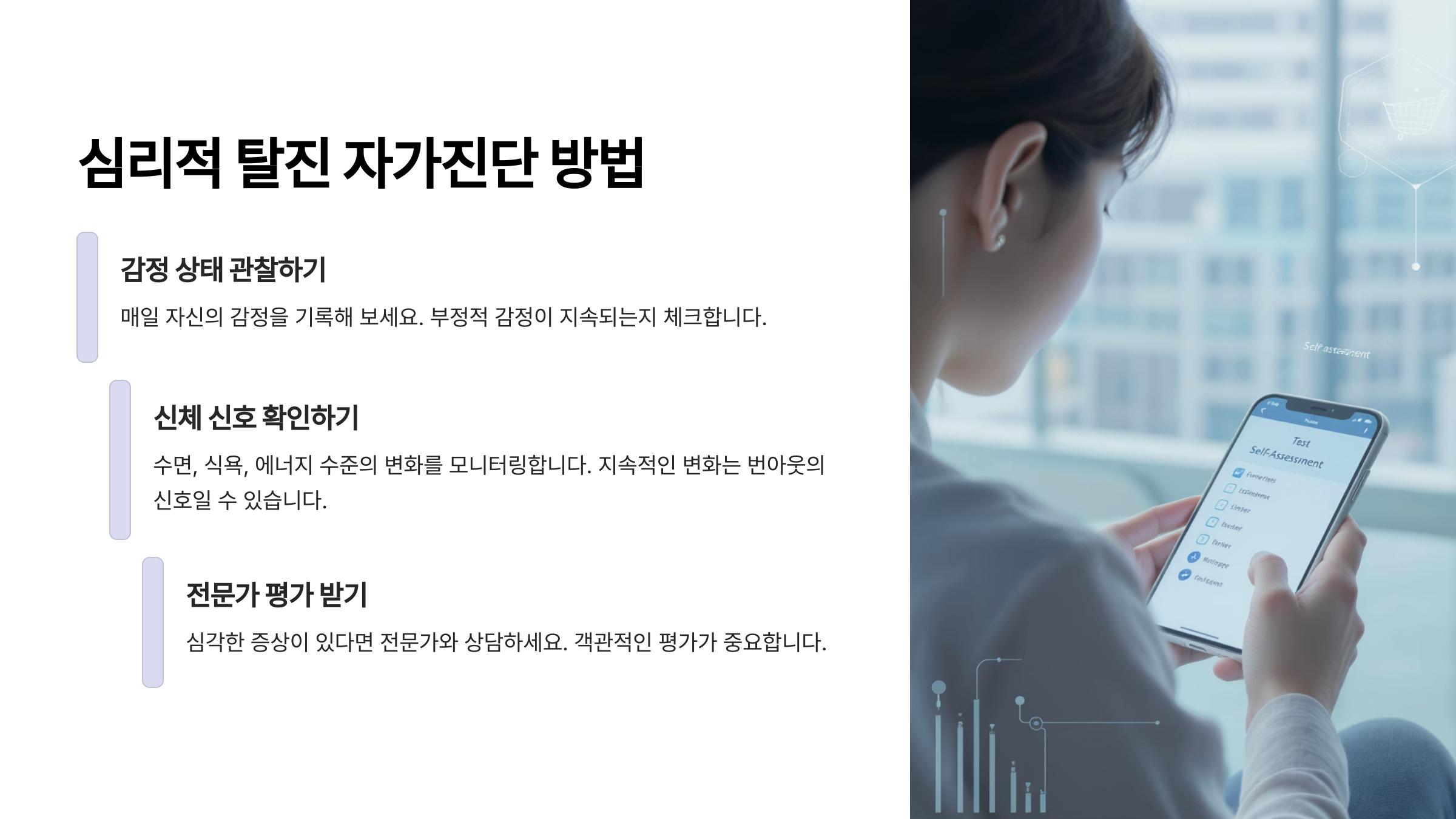 결론적으로, 피로는 ‘오늘 내가 좀 힘들구나’라는 신호이고, 번아웃은 ‘내가 이대로 살아도 되는 걸까’라는 질문이에요. 다음 섹션에서는 심리적 탈진 자가진단을 통해 더 구체적으로 나의 상태를 들여다볼 거예요.🧠🧩