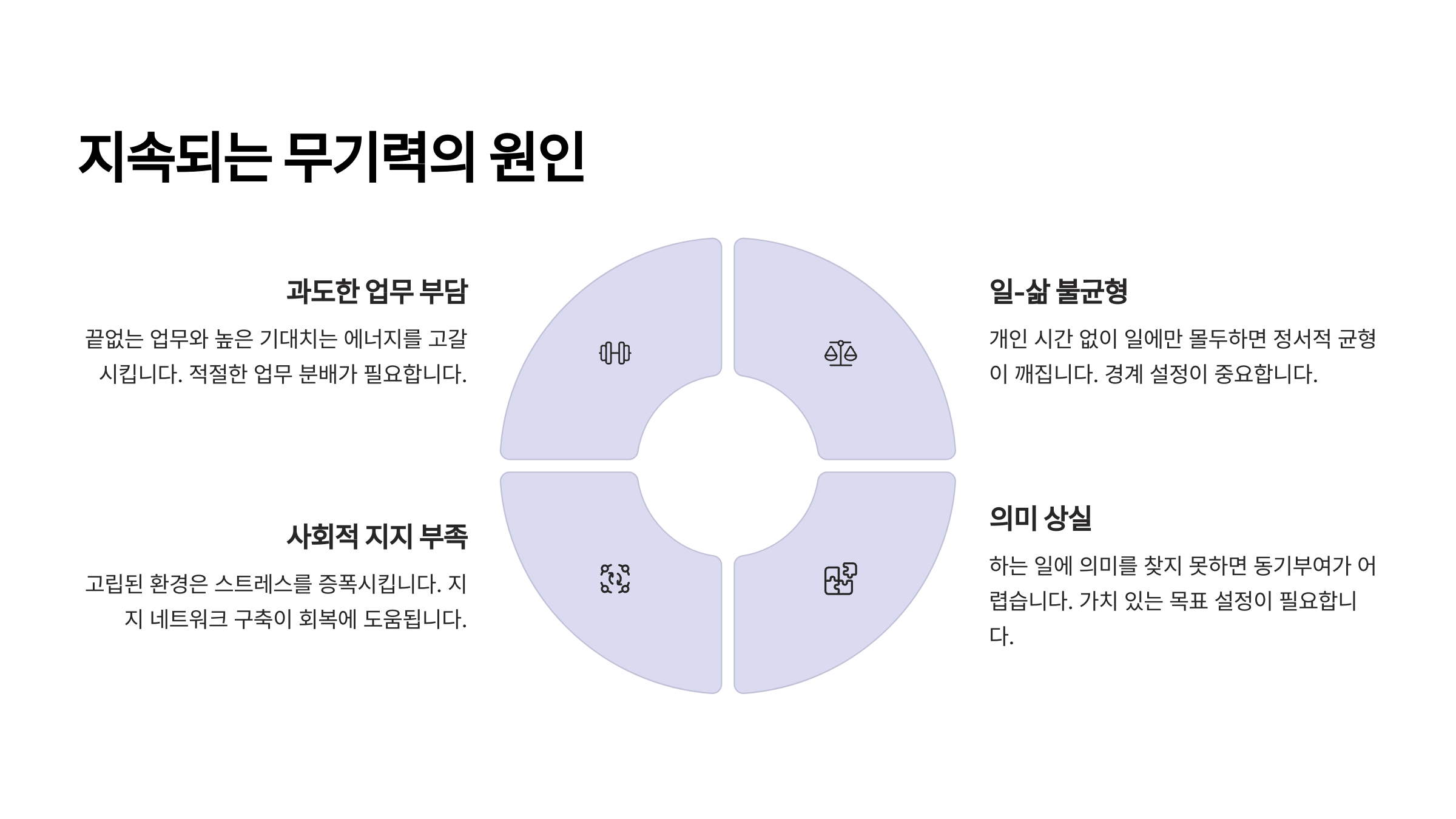 무기력은 단순한 ‘귀찮음’이 아니에요. 반복되는 감정의 마비, 집중력 저하, 무의미감 등으로 연결되며 삶 전반에 영향을 줘요. 이 무기력감이 길어질수록 번아웃으로 이어지기 쉽죠. 원인을 알면, 해결의 실마리도 잡을 수 있어요.
