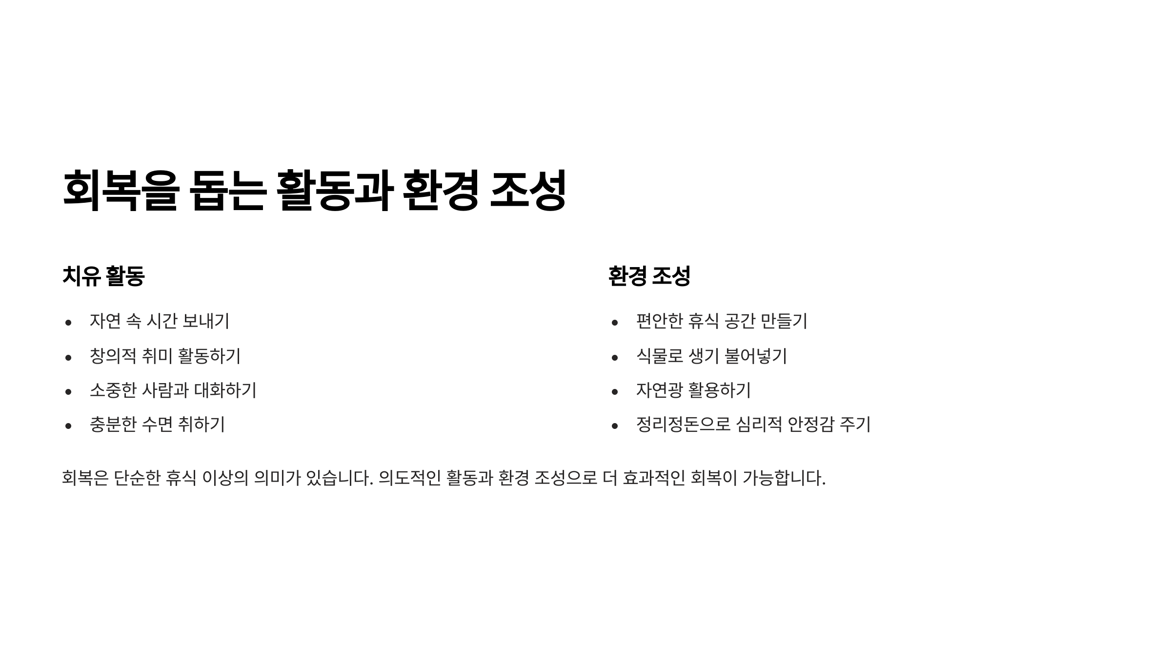 | 회복 방식 | 수면, 음식, 휴식 | 환경 개선, 감정 회복 |