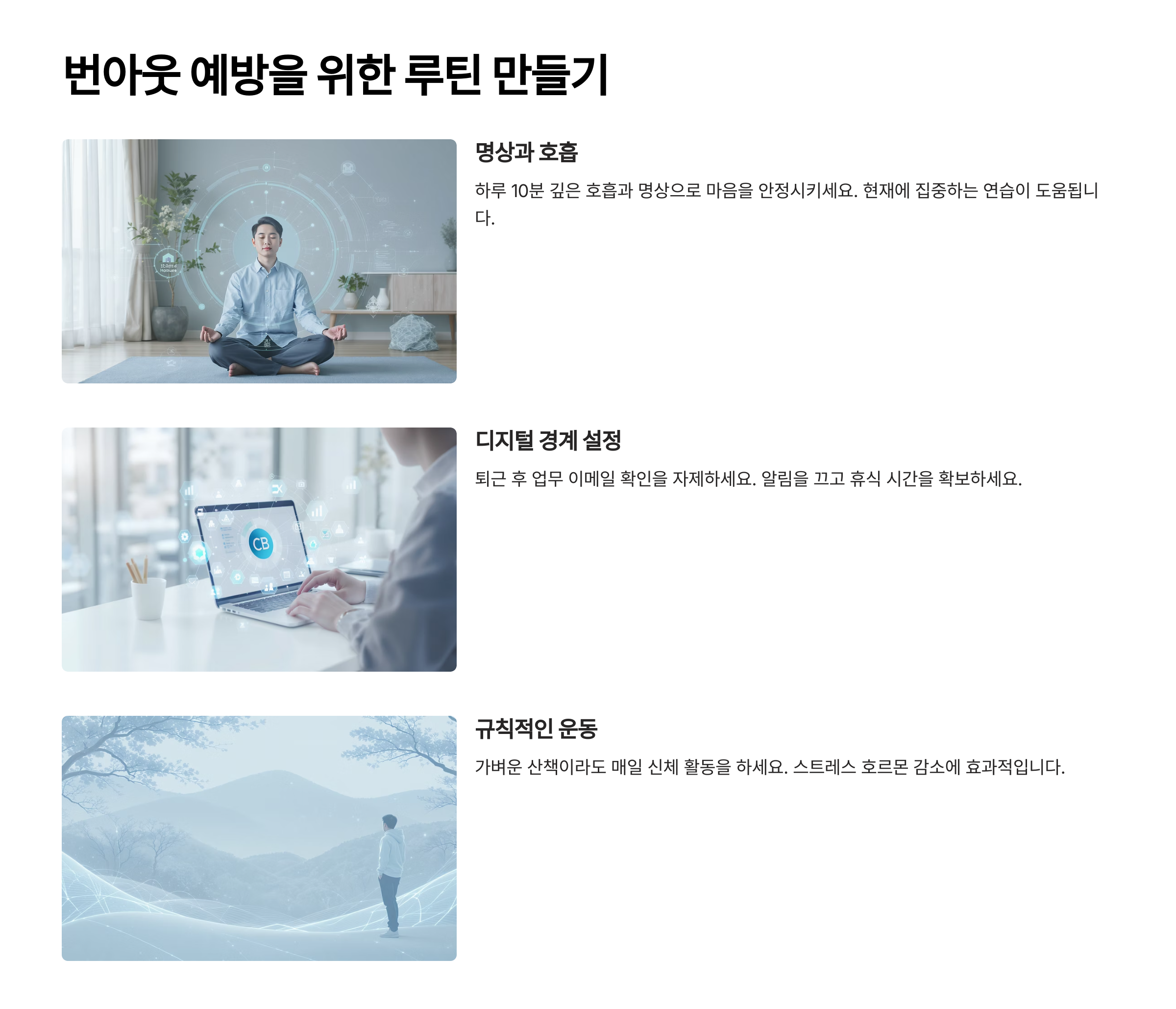 번아웃을 예방하려면 평소의 생활 루틴을 안정적으로 유지하는 것이 정말 중요해요. 루틴은 우리가 매일 반복하는 습관들이고, 이 습관들이 심리적 에너지의 균형을 만들어주거든요. 작지만 강력한 루틴 하나가 번아웃을 멀리하게 해줘요. 😊