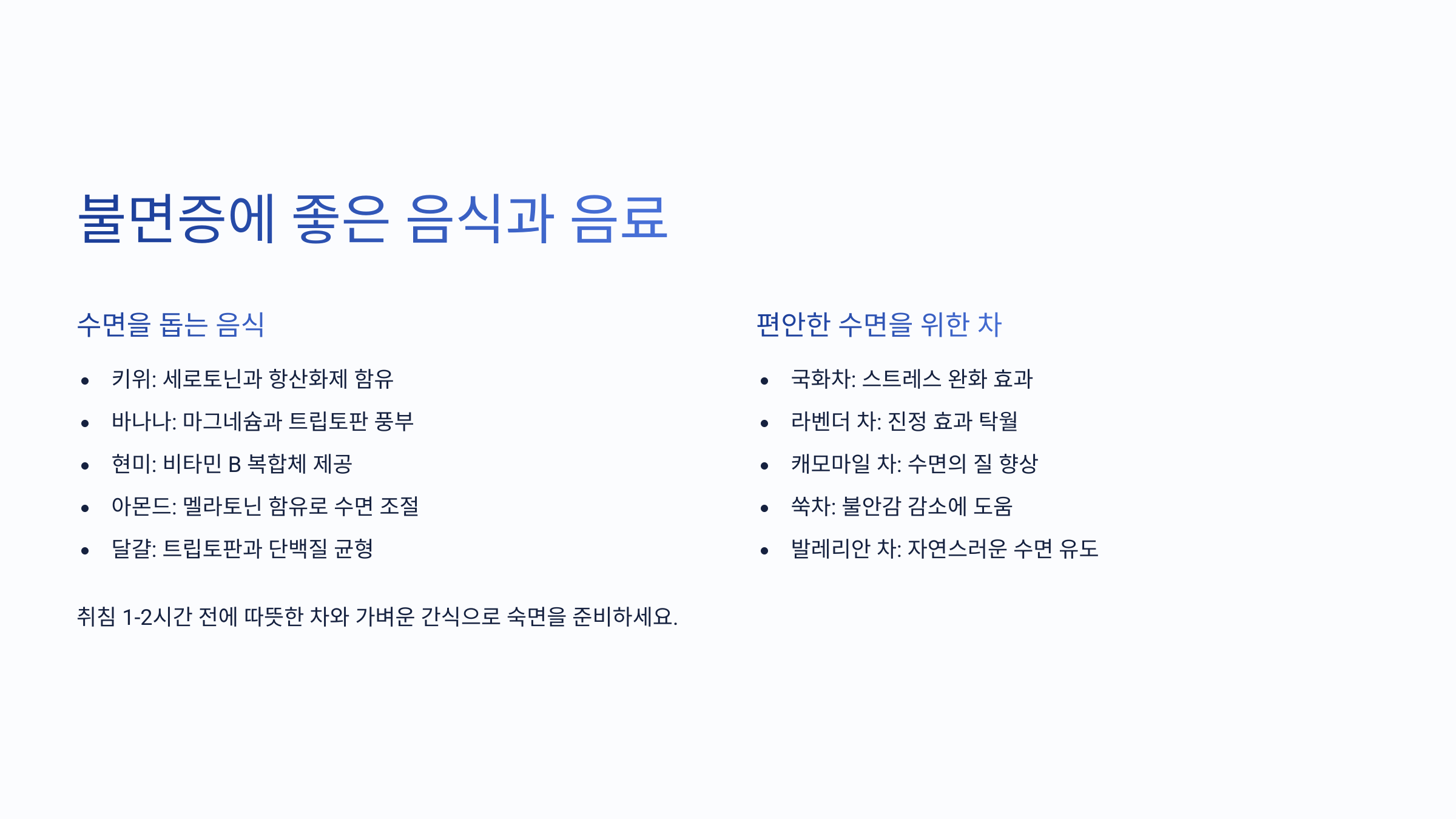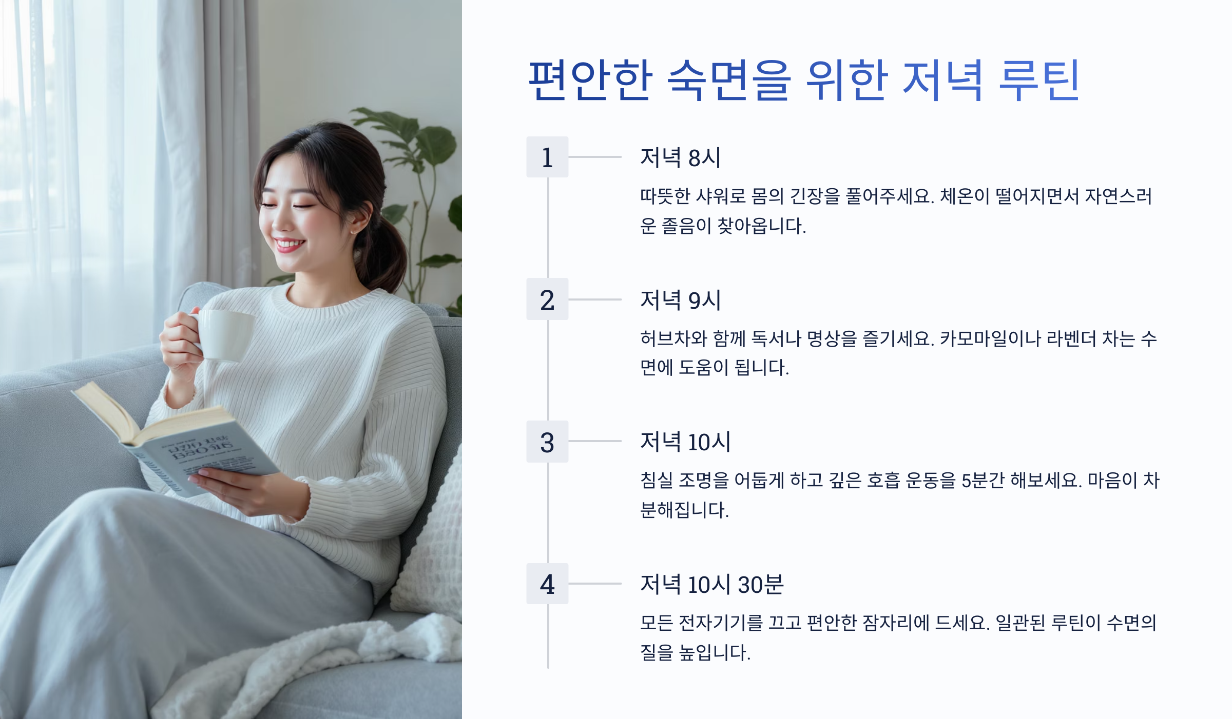숙면을 유도하려면 저녁 시간의 루틴이 매우 중요해요. 가장 좋은 방법은 신호를 주는 것이에요. 매일 비슷한 시간에 조명을 낮추고, 따뜻한 차를 마시고, 명상이나 스트레칭을 하면 뇌는 '아, 이제 잘 시간인가?'라고 인식하거든요.