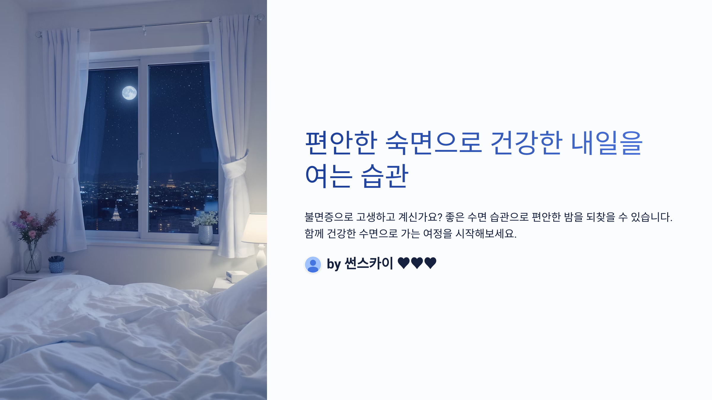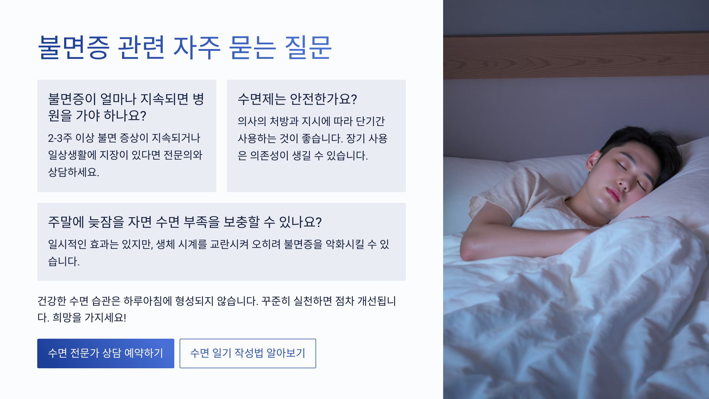 수면은 곧 삶의 질이에요. 불면증을 가볍게 여기지 말고, 오늘부터라도 하나씩 실천해보세요. 매일 잘 자는 연습이 여러분의 내일을 바꿀 수 있어요. 🌙