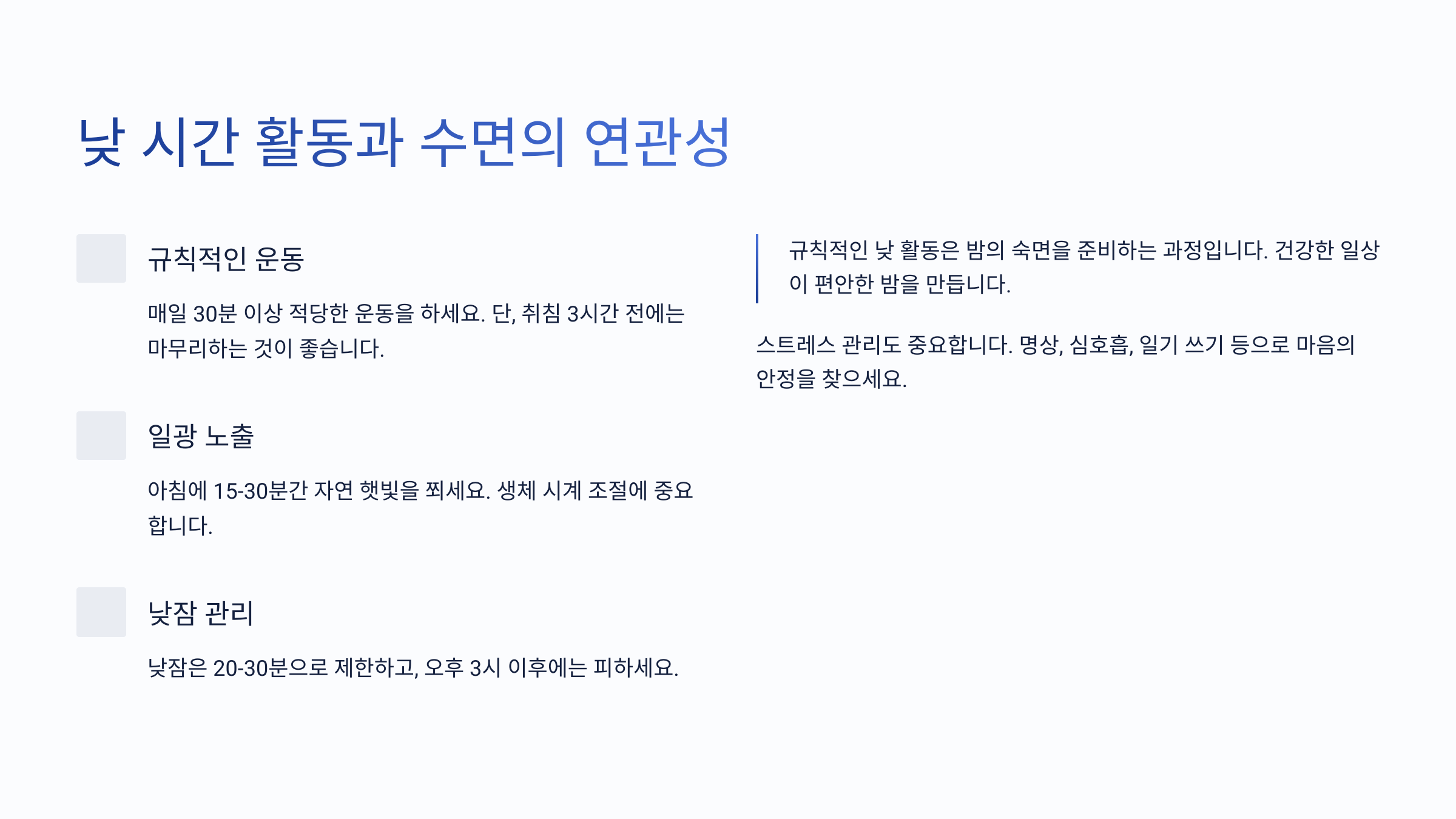 낮에 어떻게 활동하느냐도 밤의 수면에 큰 영향을 줘요. 특히 햇빛을 얼마나 쬐었는지, 얼마나 움직였는지, 스트레스를 어떻게 해소했는지가 모두 연결되어 있죠. 아침에 햇빛을 15분 이상 받는 것만으로도 생체리듬이 조절돼요.