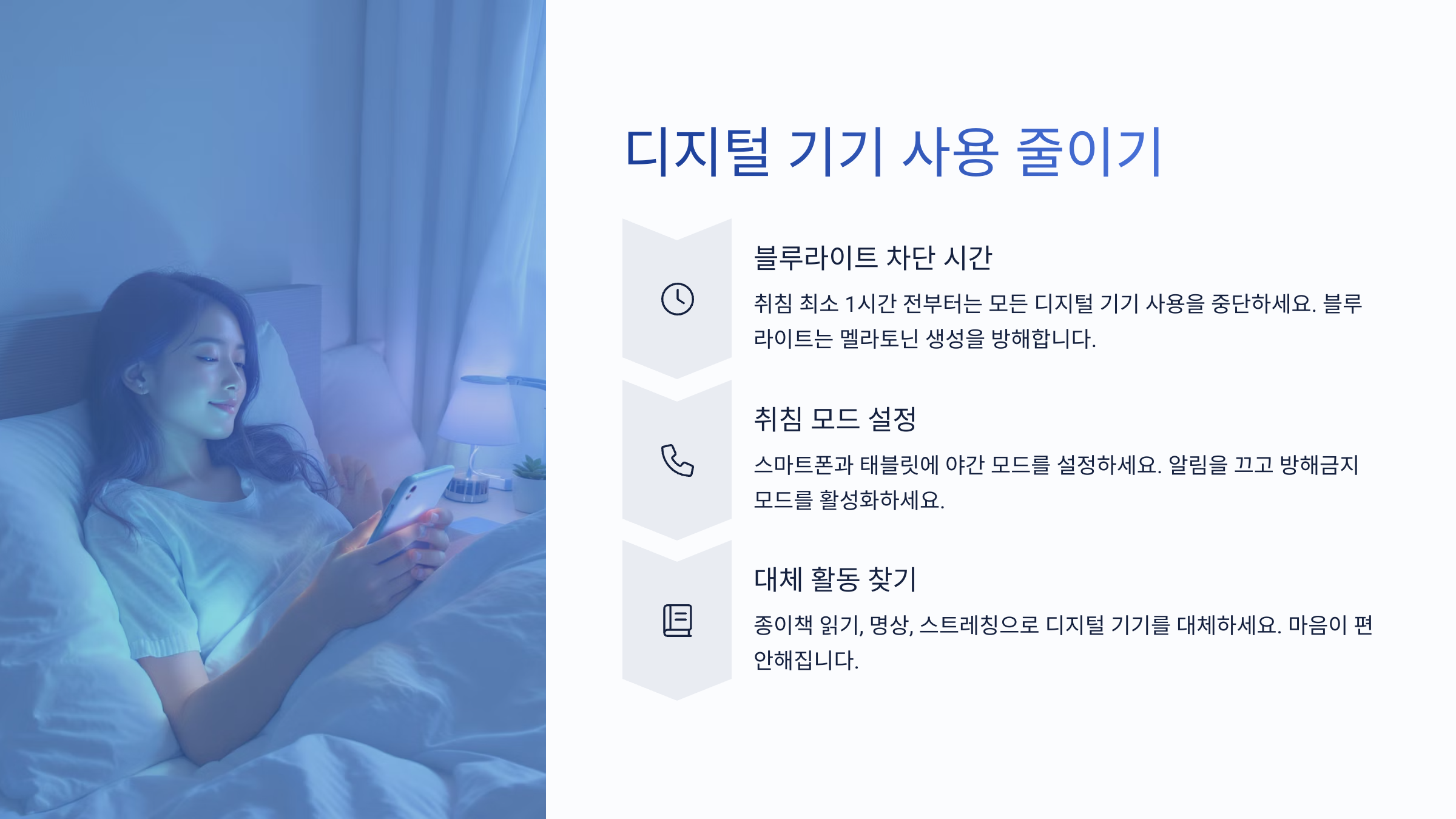 이럴 때는 1시간 전부터 ‘디지털 디톡스’ 타임을 정해보세요. 스마트폰은 침실 밖에 두고, 자명종 시계를 따로 사용하는 것도 좋아요. 대신 아날로그 책이나 저자극 팟캐스트 같은 콘텐츠로 대체하는 게 좋답니다.