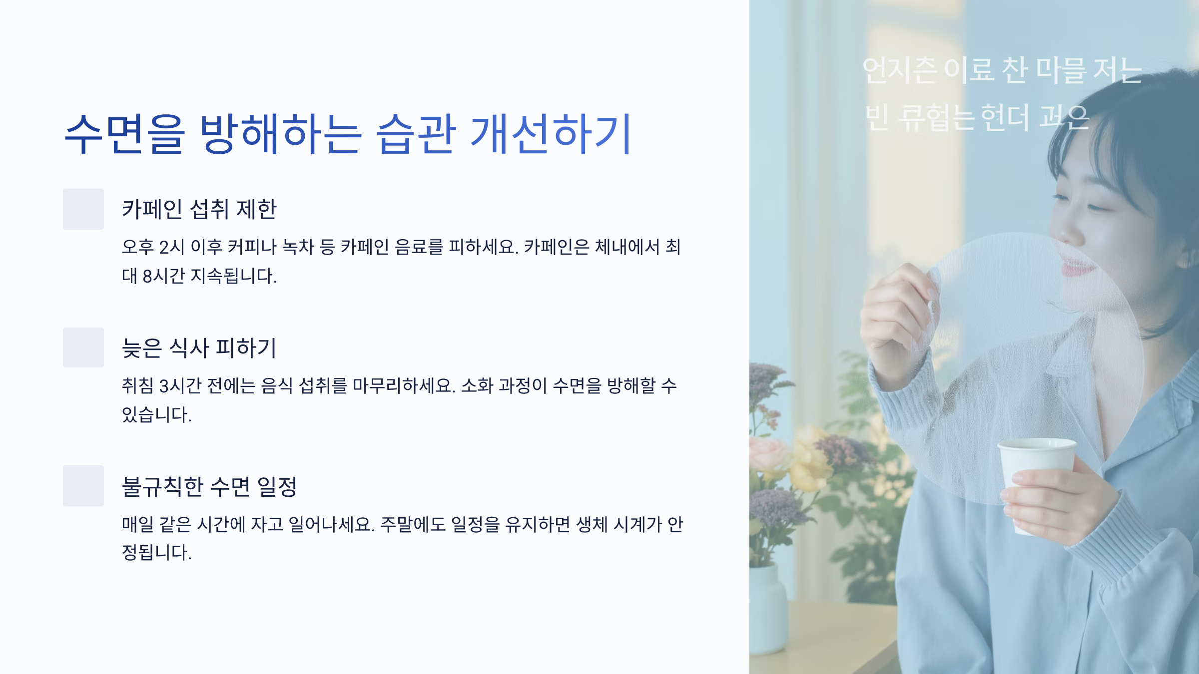 잠을 자고 싶은데 쉽게 잠들지 못하고 뒤척이게 될 때 정말 괴롭죠. 밤이 깊어질수록 오히려 머리는 더 또렷해지고, 시계만 바라보게 되는 그 느낌... 많은 사람들이 불면증으로 고통받고 있어요. 단순히 ‘잠이 안 와서’가 아니라 생활 전반의 습관이 수면에 영향을 주기 때문이에요.