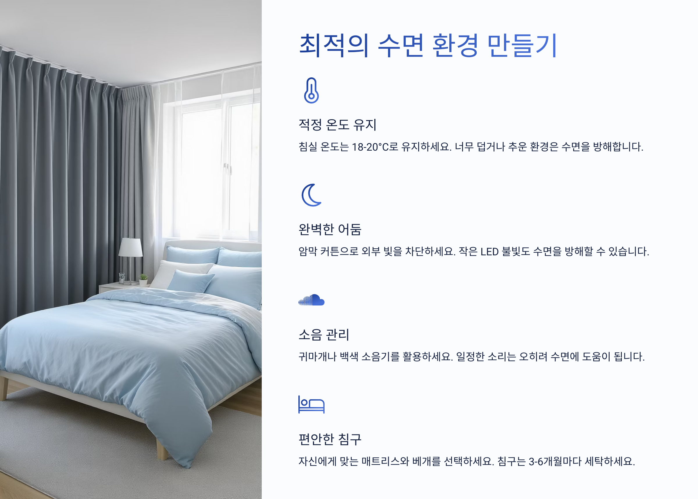 수면은 환경과 밀접하게 연결되어 있어요. 침실의 온도, 조명, 침구, 소리, 냄새까지 모두 수면의 질에 영향을 줘요. 간단한 변화만으로도 불면증을 완화할 수 있는 경우가 많아요.