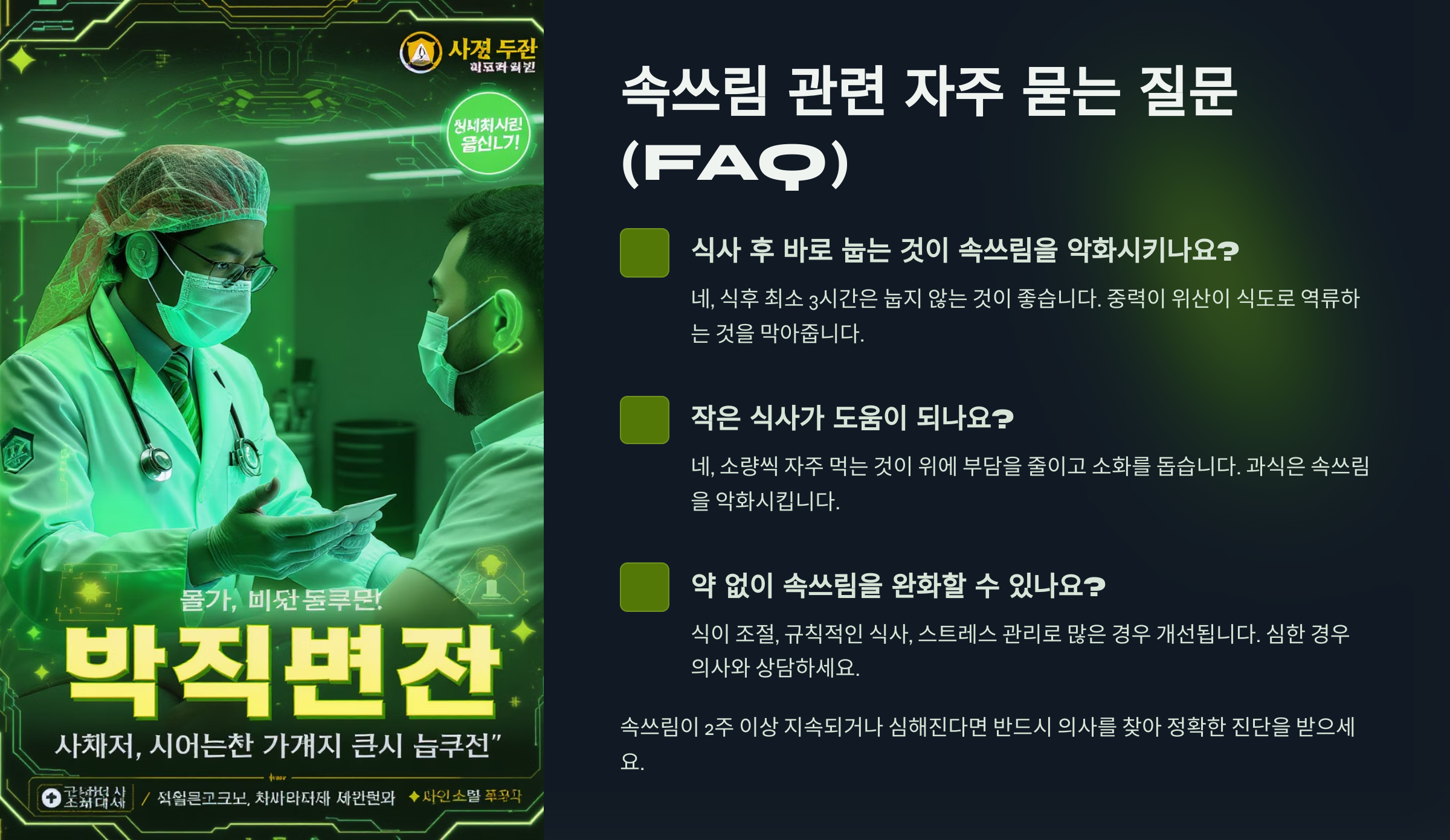 이제 마지막으로 많은 분들이 궁금해하는 속쓰림 관련 질문들, 바로 FAQ 코너에서 정리해드릴게요! 💬📌