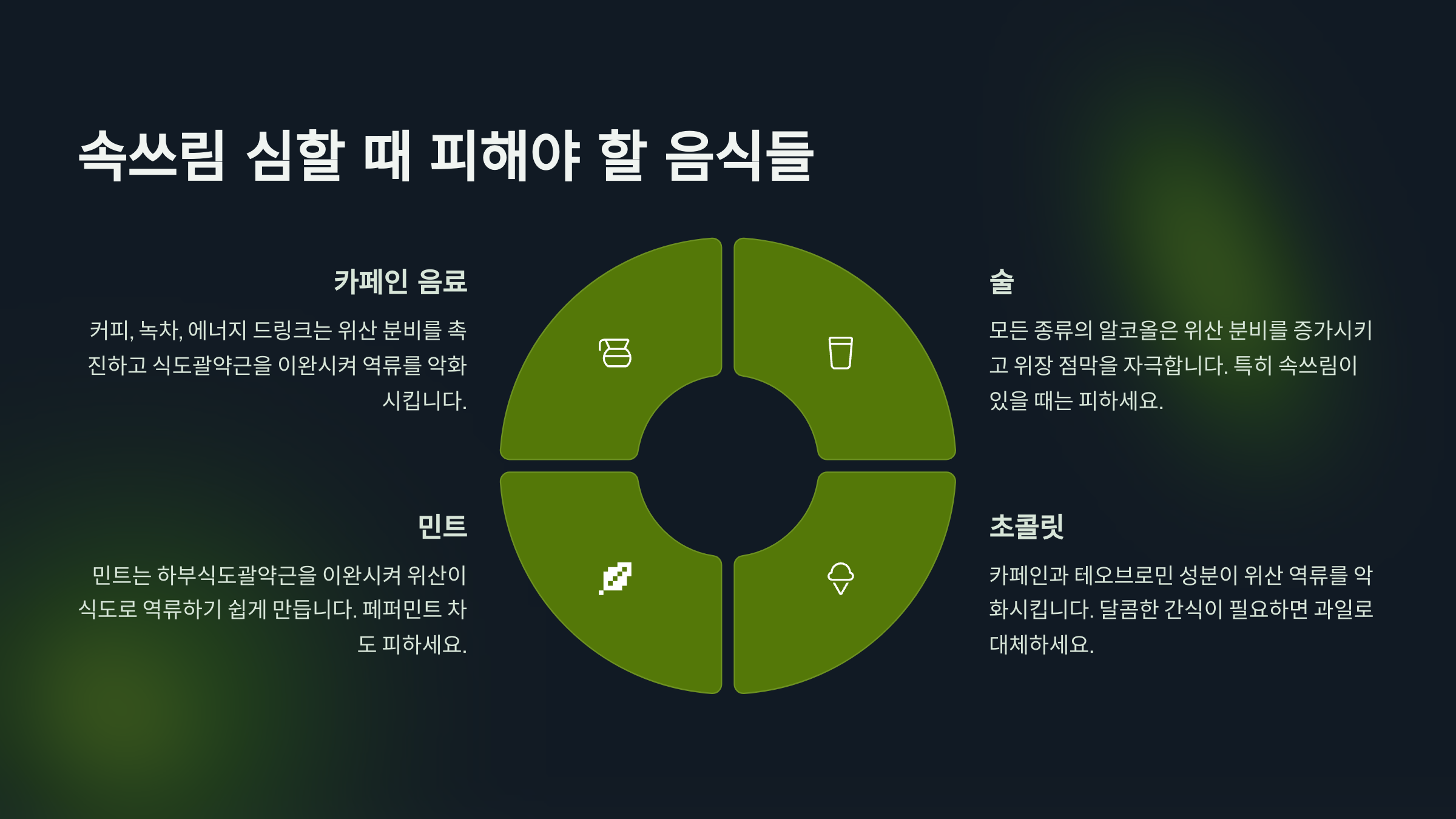 속쓰림을 피하고 싶다면 우선 어떤 음식이 위산 분비를 자극하는지 정확히 아는 게 중요해요. 대표적으로 고지방 음식과 튀긴 음식, 카페인, 초콜릿, 탄산음료, 알코올이 속쓰림을 유발하는 주범이죠. 이들 음식은 위장 활동을 느리게 하거나 식도 괄약근을 이완시켜 위산 역류를 촉진해요.
