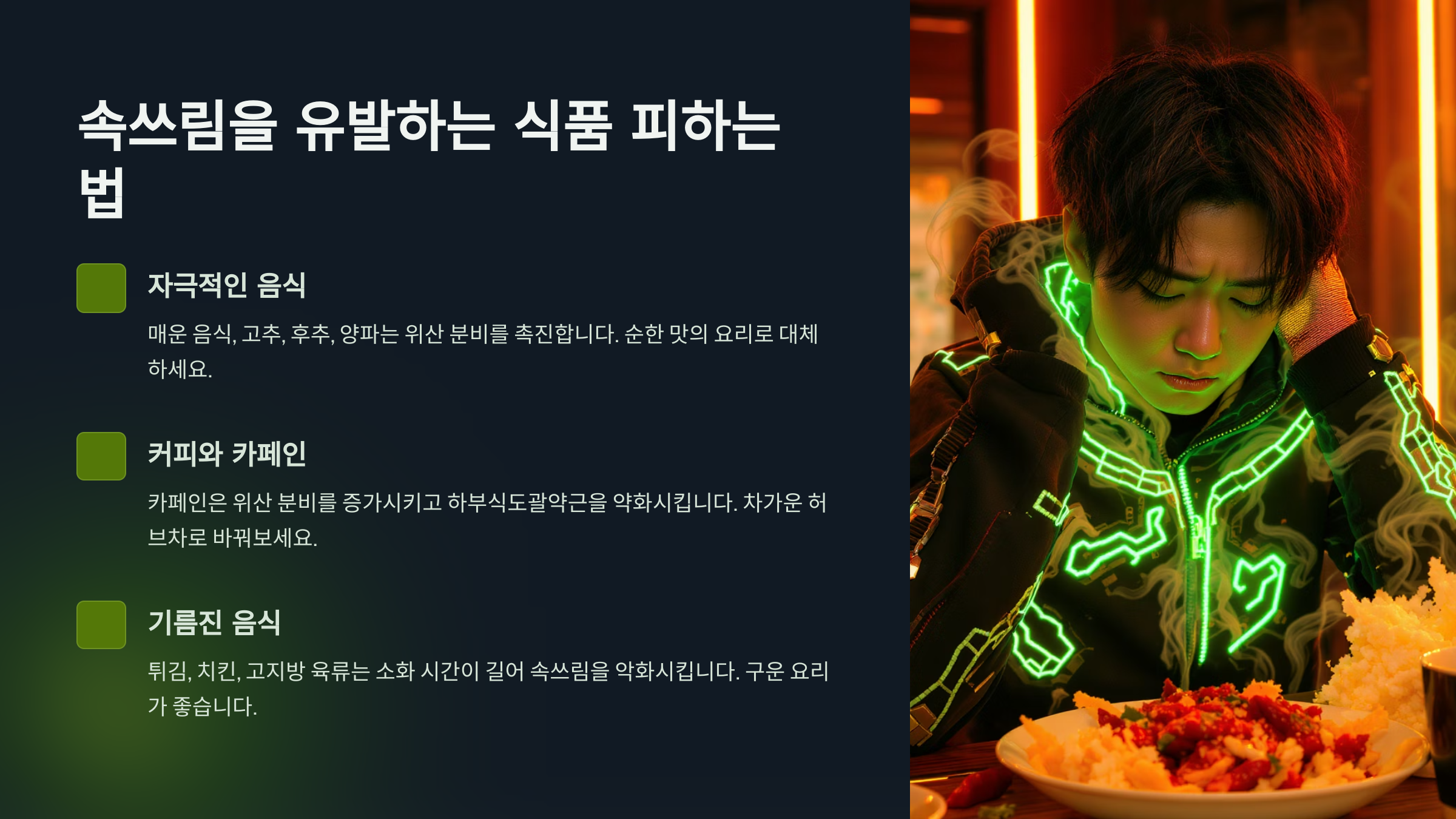 그다음은, 속쓰림이 심할 때 반드시 피해야 할 음식들에 대해 자세히 알려줄게요. 지금 속이 불편하다면 꼭 참고해야 할 내용이에요! ❌🍲