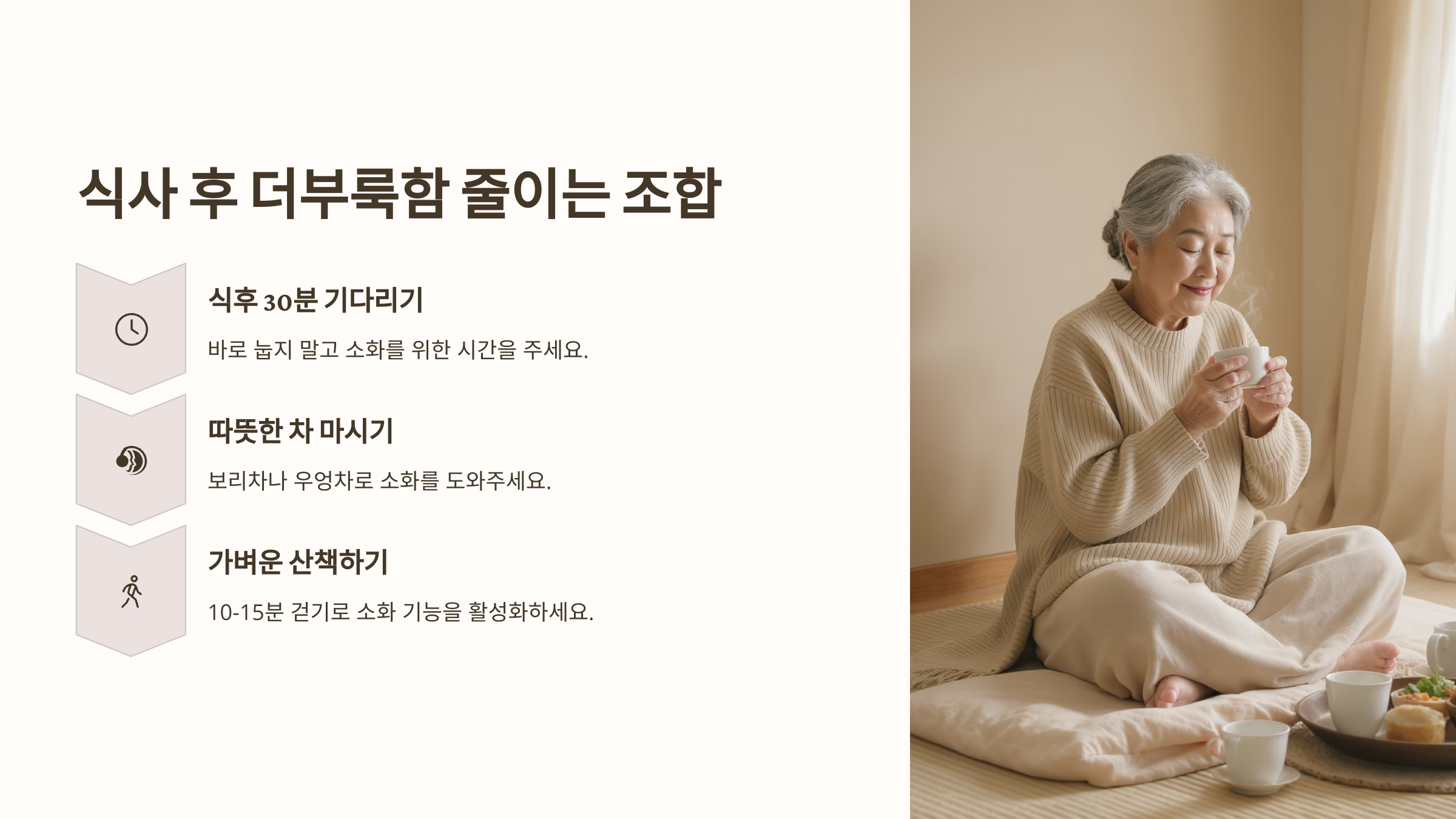 가벼운 산책은 최고의 소화제예요. 식후 15분 정도 느긋하게 걷기만 해도 위장 운동이 활발해지고, 가스나 트림도 줄어들어요. 절대 식후 바로 눕지 말 것!