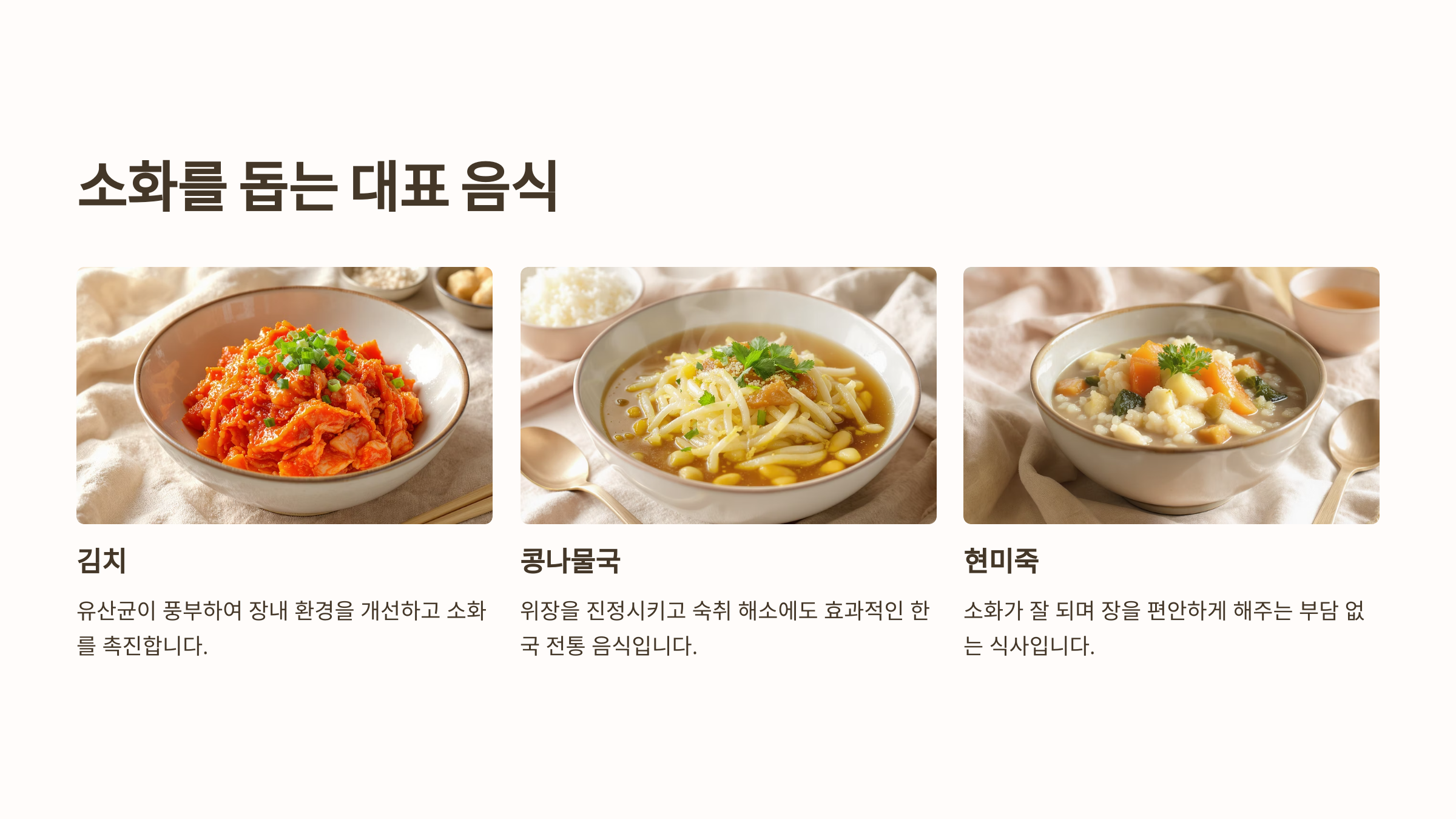 예를 들어 흰죽은 소화기능이 약한 사람들에게 가장 추천되는 음식 중 하나예요. 자극이 없고 부드럽기 때문에 병원식으로도 많이 쓰이죠. 또 바나나는 천연 소화 효소와 함께 장을 진정시키는 효과도 있어요.