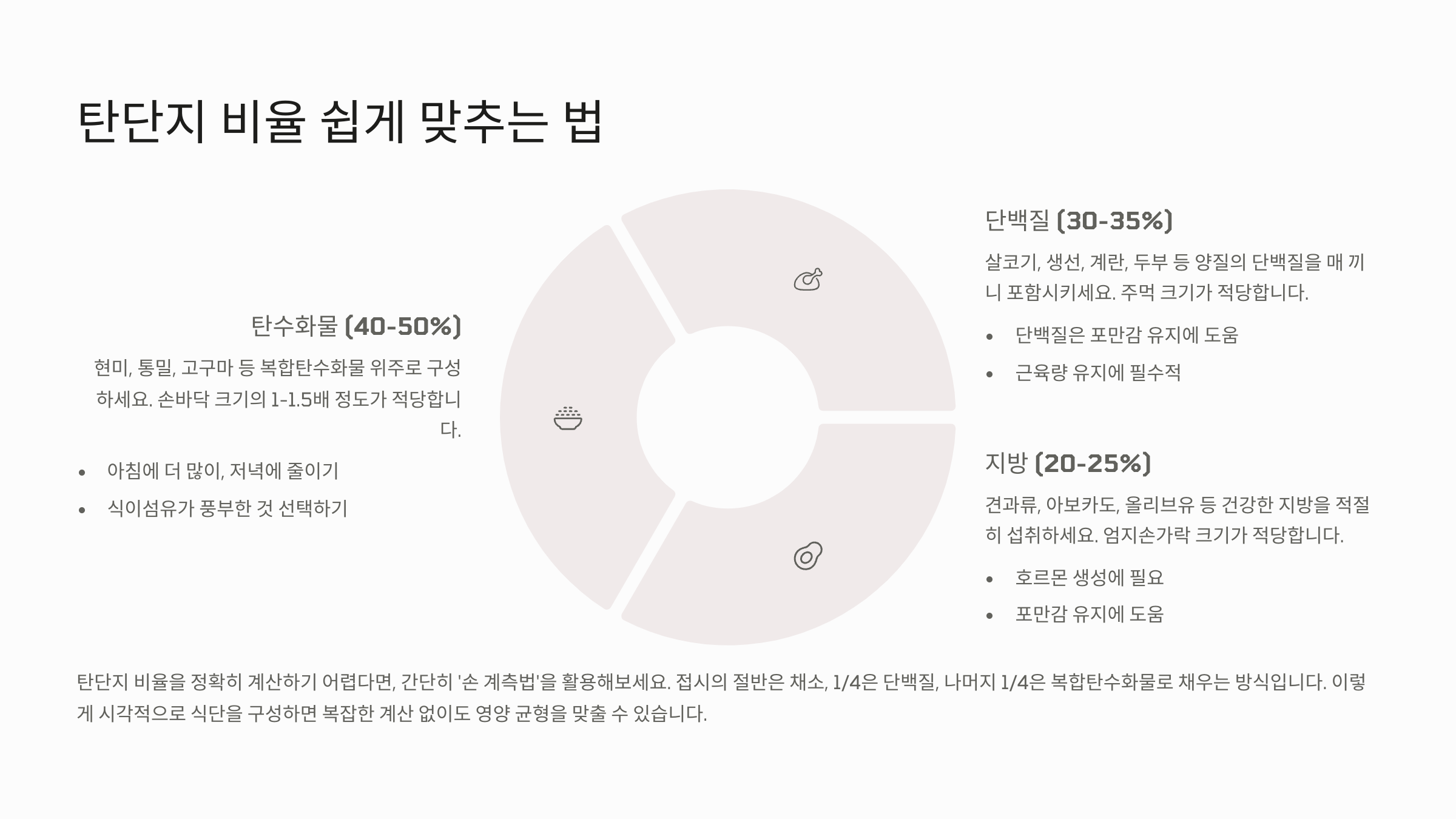 균형 잡힌 탄단지 구성은 다이어트 효과뿐 아니라 건강한 생활 유지에도 큰 도움이 돼요. 무조건 저탄고지, 고단백보다는 내 몸에 맞는 비율을 찾아보는 게 가장 중요해요!