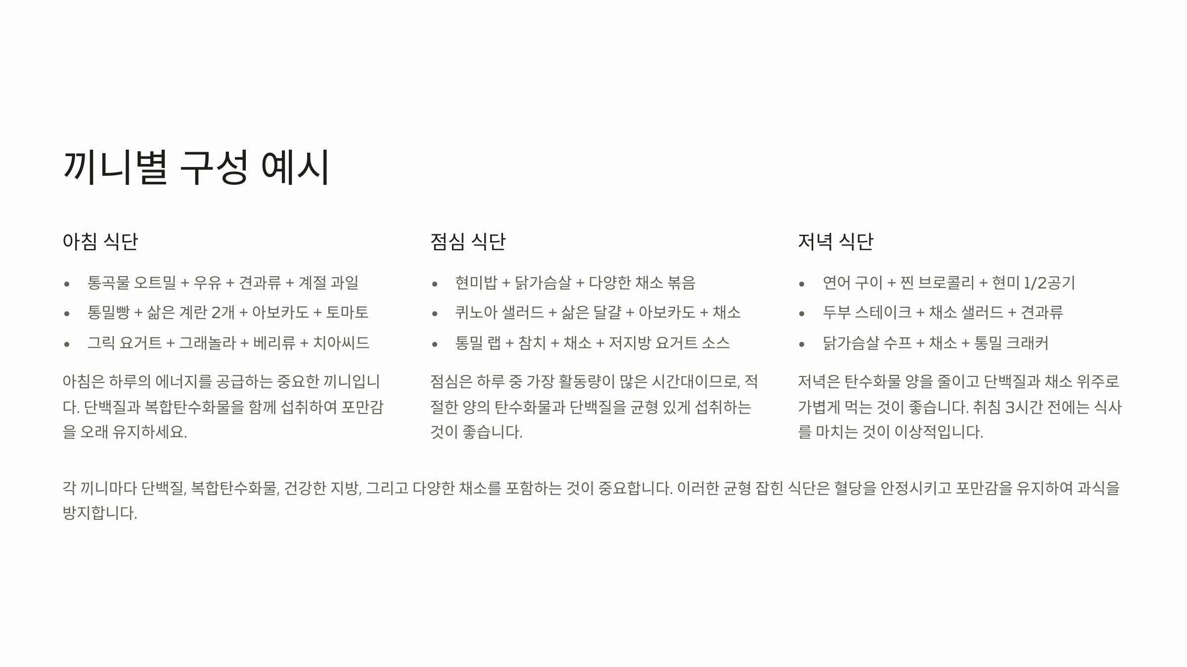 | 아침 | 오트밀, 달걀, 과일 | 에너지 공급 + 포만감 |