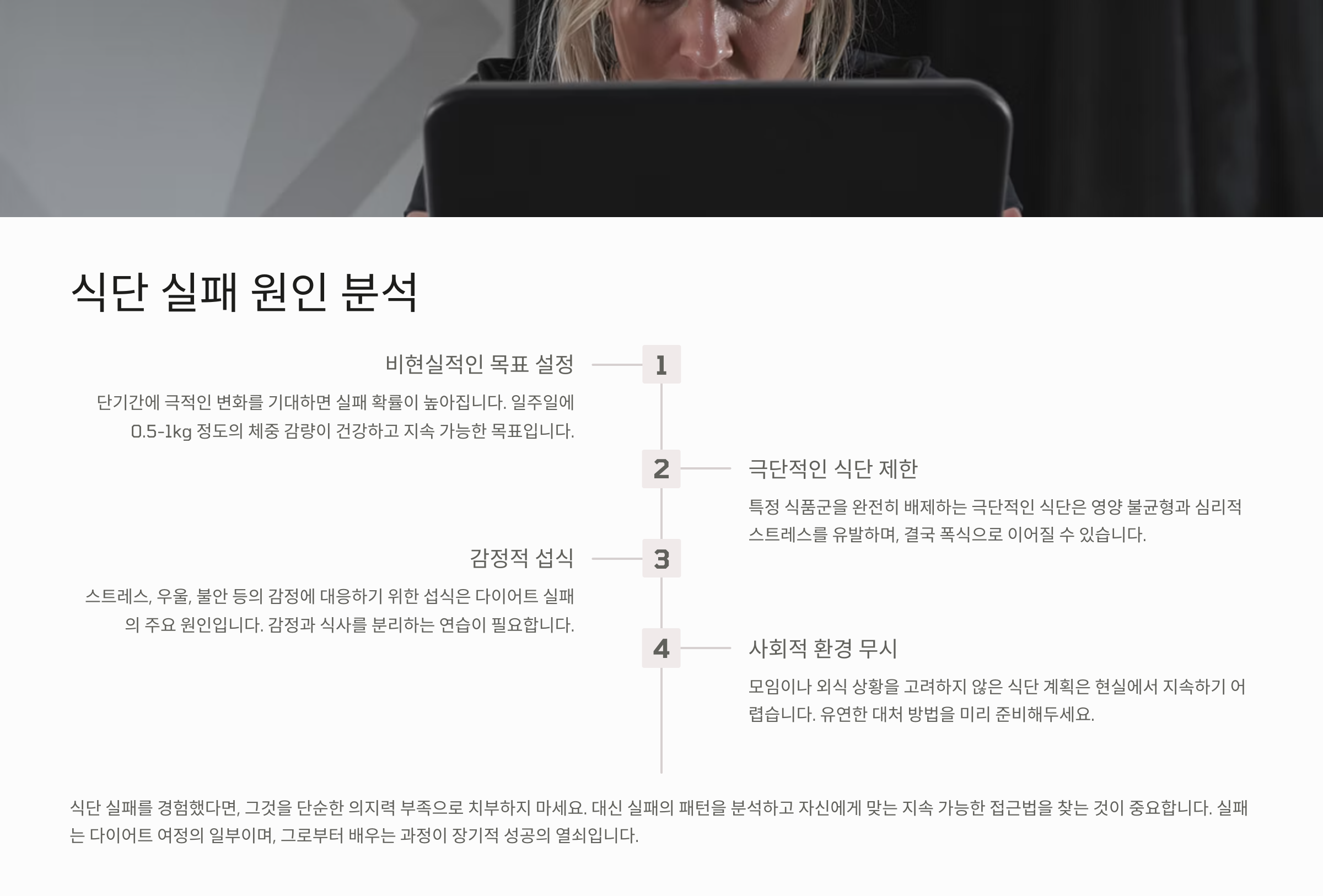 두 번째는 음식 제한이 지나치게 많을 때예요. 먹을 수 있는 음식이 너무 적으면 심리적으로 피로가 쌓이고, 결국 폭발해서 식단을 포기하게 돼요.