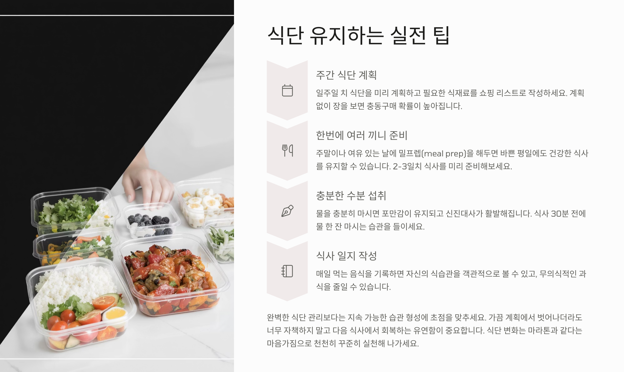 식단을 계획하는 것보다 더 어려운 건, 그걸 "꾸준히 지키는 것"이에요. 작심삼일로 끝나지 않으려면 전략이 필요해요. 스스로를 속이지 않는 선에서, 부담 없는 방식을 찾아야 해요.