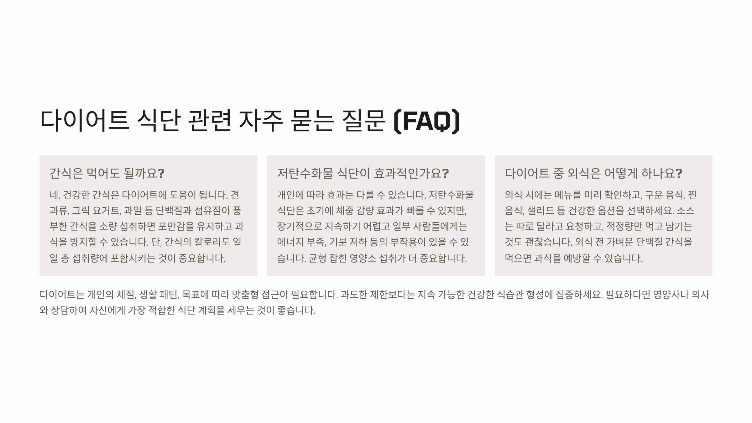 정리하자면, 다이어트 식단의 핵심은 칼로리 조절, 균형 잡힌 영양, 적절한 수분 섭취 이 세 가지예요. 이 원칙을 기억하면 실패 확률이 훨씬 줄어들어요.