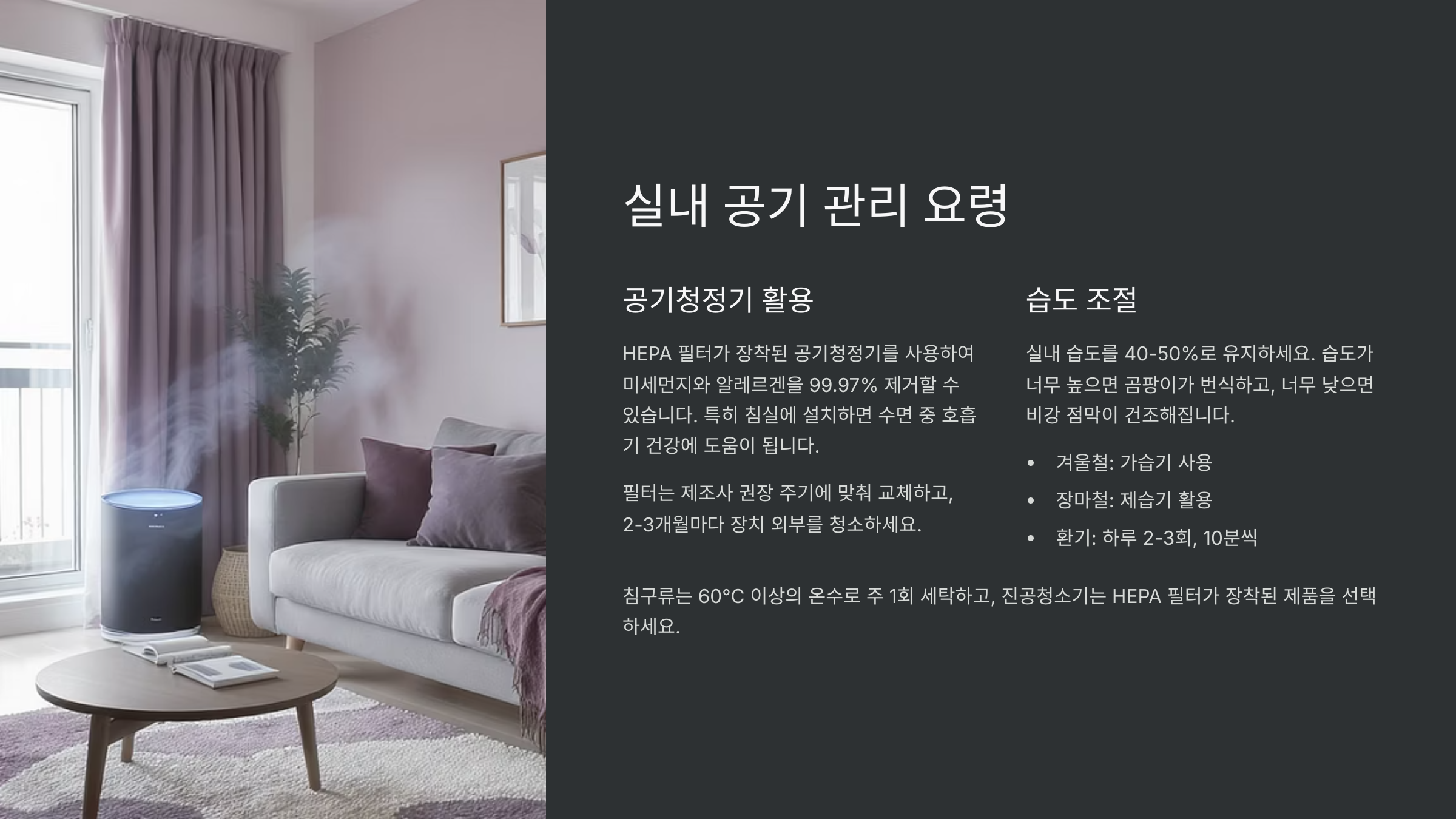 내 방의 공기를 어떻게 관리하느냐가 비염 증상의 70%를 결정해요. 지금 바로 실천해보세요!