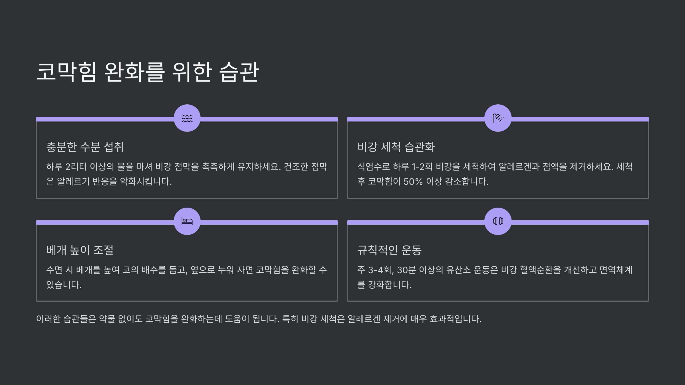알레르기 비염의 대표 증상 중 하나가 코막힘이에요. 숨쉬기 불편하면 집중력도 떨어지고, 수면의 질도 나빠져요. 일상에서 실천할 수 있는 간단한 습관만으로도 많은 도움이 된답니다.