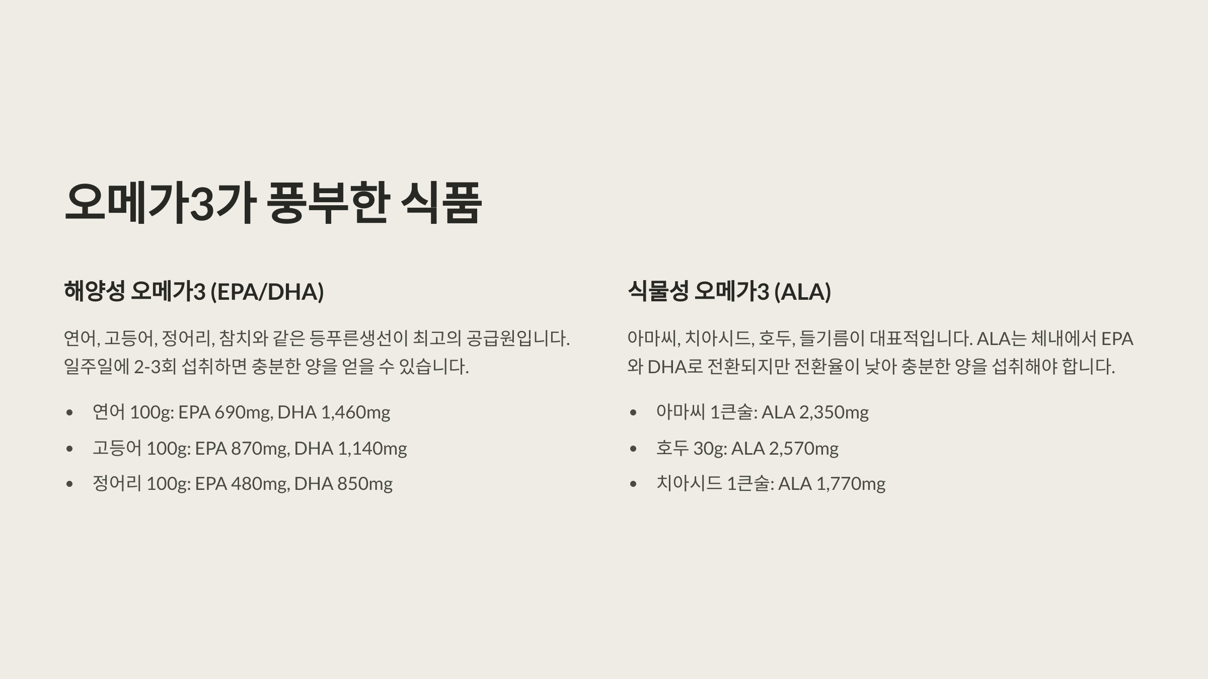 | 아마씨 | ALA | 식물성 대체 가능 |