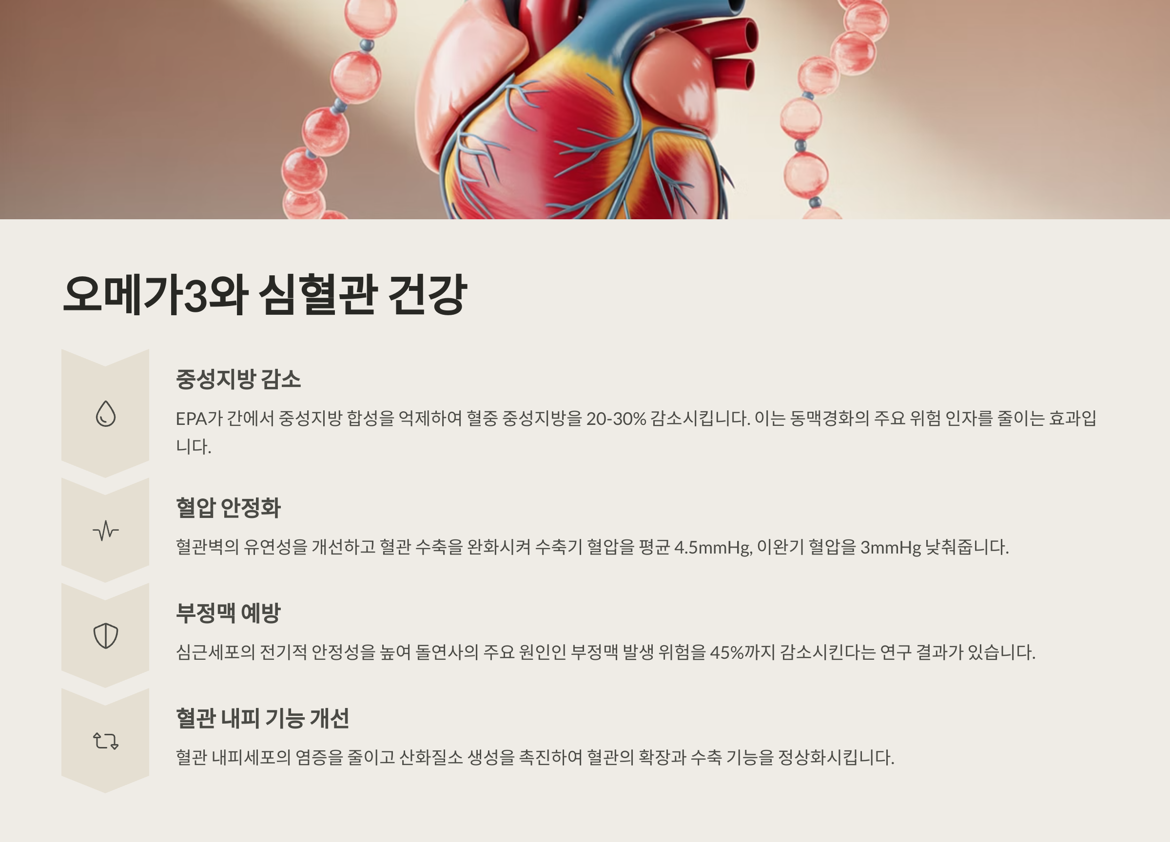 오메가3가 가장 널리 알려진 효능은 바로 심혈관 질환 예방이에요. 꾸준히 복용하면 혈압을 낮추고, 동맥 경화를 예방하는 데도 효과가 있어요.