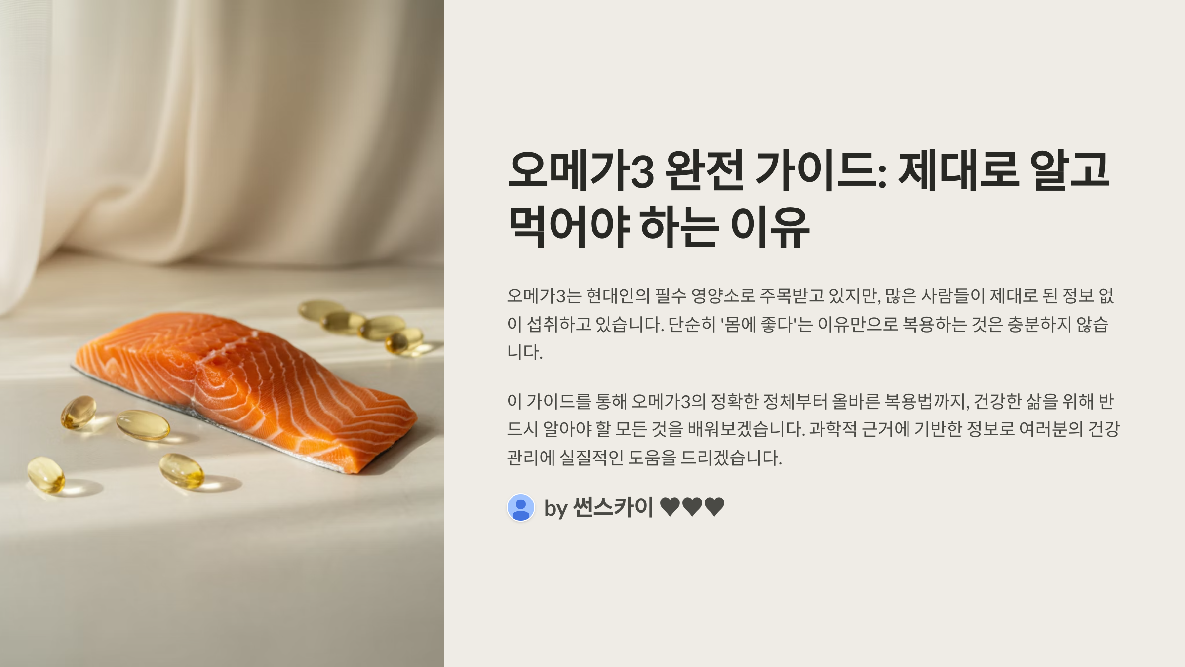 모든 건강 정보에는 맥락이 필요하죠. 그래서 이번에는 오메가3의 정의부터 주요 효능, 복용 타이밍, 식품 정보까지 종합적으로 알려드릴게요. 정말 알고 먹는 것과 모르고 먹는 건 천지차이니까요.