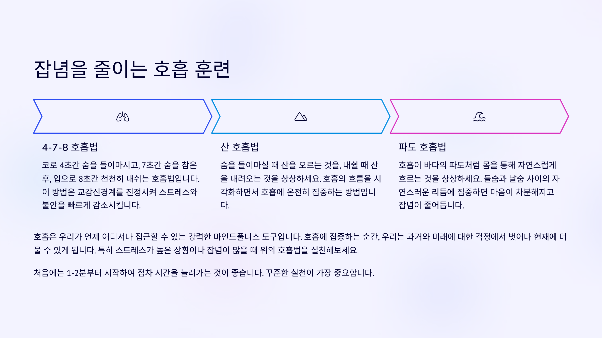 호흡은 언제 어디서나 할 수 있는 최고의 마인드풀니스 도구예요. 마음이 산만하거나 감정이 격할 때 가장 빠르게 안정시키는 방법이 바로 ‘호흡 알아차림’이죠.
