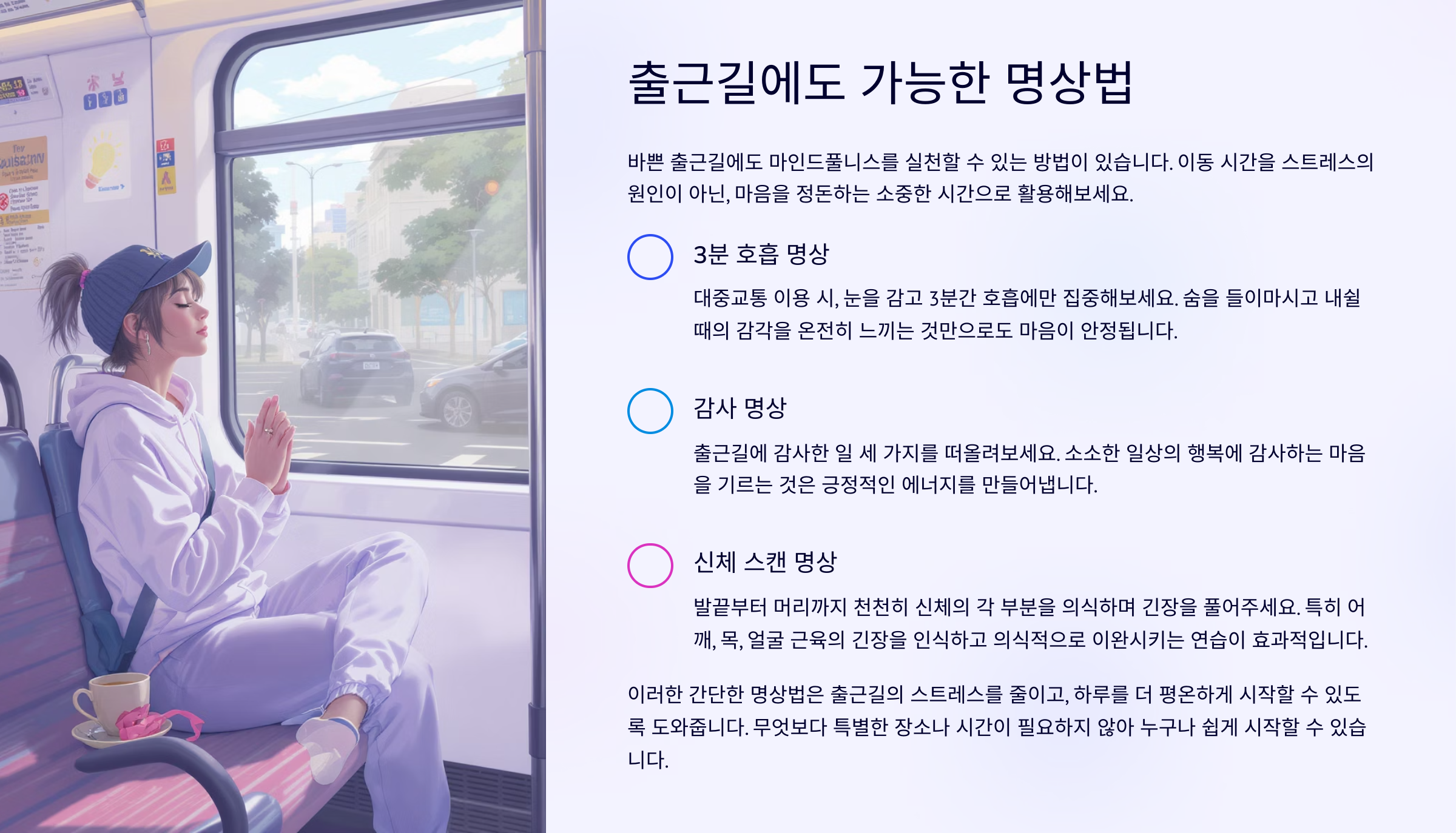 이런 짧은 명상이 출근 전 마음을 안정시키고, 하루 전체의 리듬을 부드럽게 시작할 수 있게 도와줘요. 반복되면 몸이 기억하게 되고, 출근길이 더 이상 고통이 되지 않게 된답니다 😊