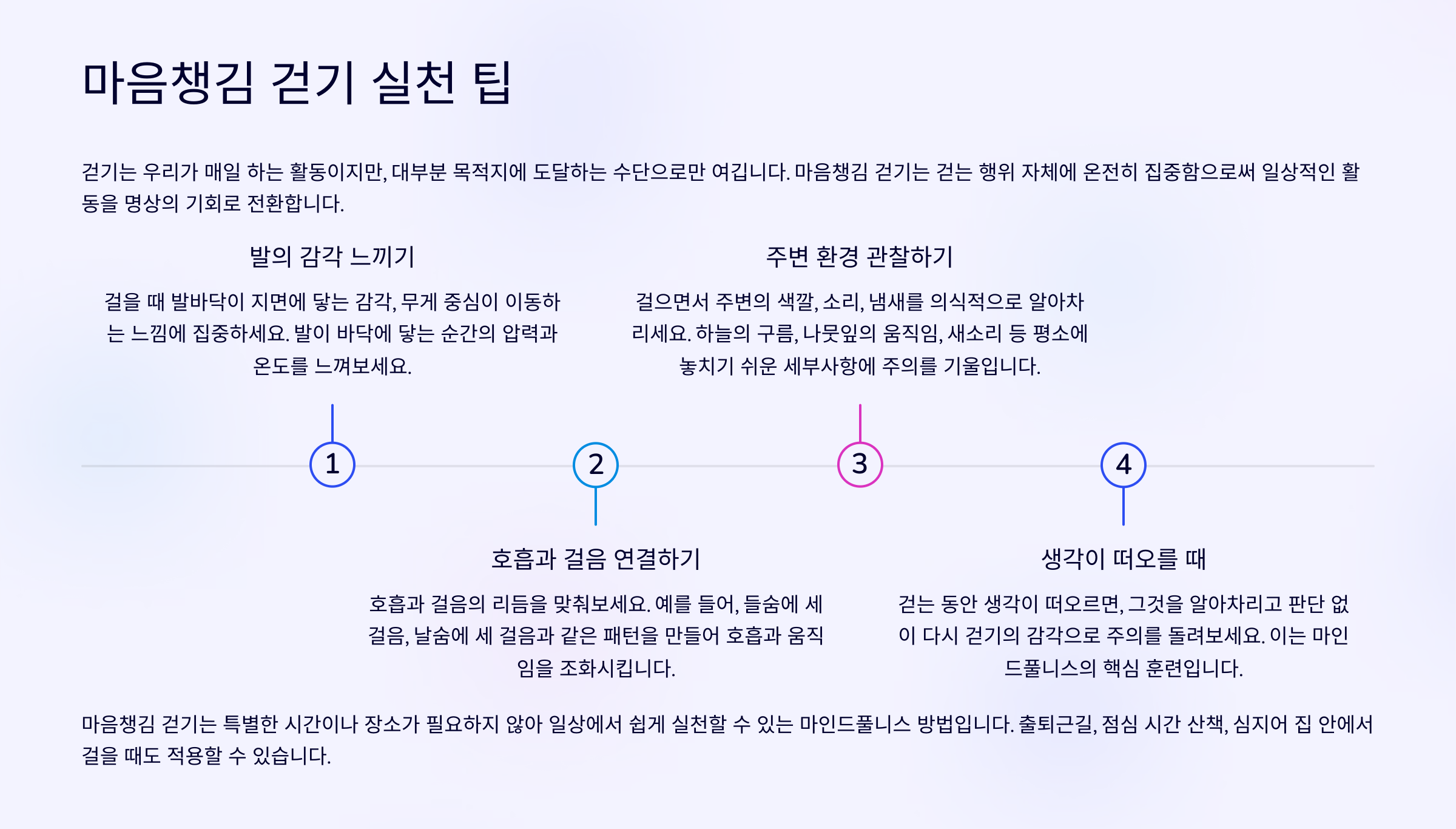 먼저 걷기 전 잠시 멈춰서 발바닥이 지면에 닿는 느낌을 인식해보세요. 걷기 시작하면 발끝에서 발꿈치까지 무게 이동을 느끼고, 걷는 동안 들리는 소리와 주변 공기를 느껴보는 거예요.