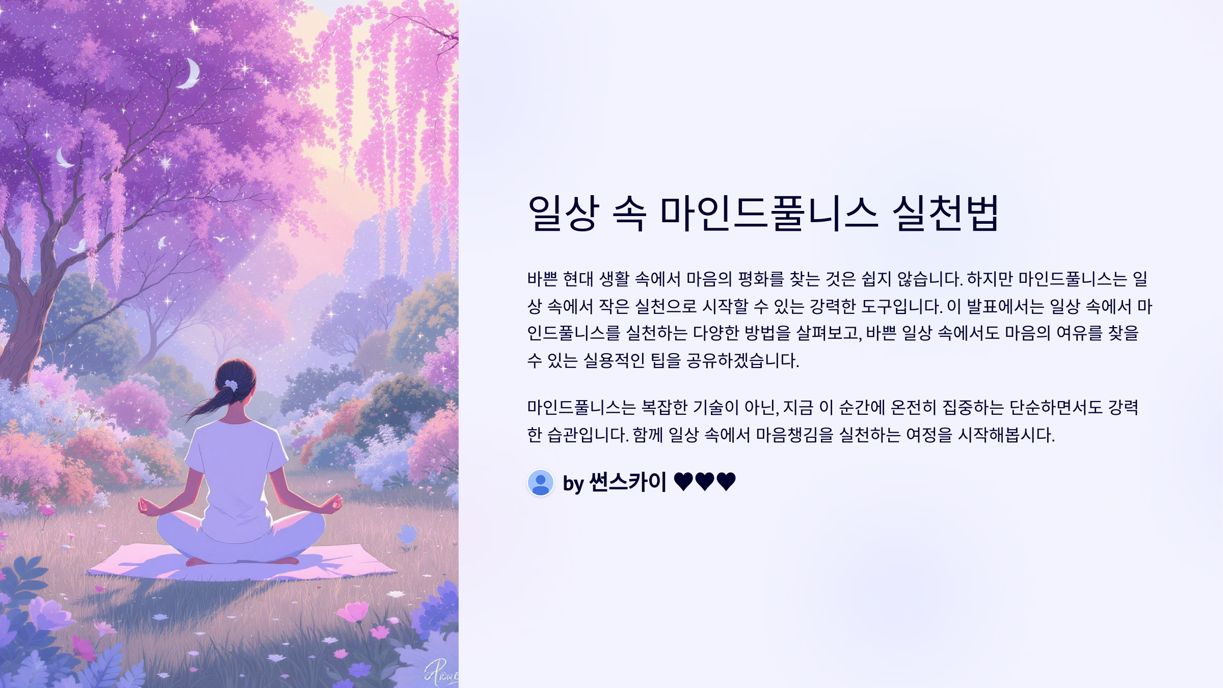 마인드풀니스는 단순한 명상 기술이 아니라 일상 전체를 살아내는 방식이에요. 식사할 때, 걷는 순간, 대화하는 중에도 적용할 수 있는 ‘지금에 머무는 연습’이죠. 내가 생각했을 때 가장 큰 변화는 생각을 흘려보낼 수 있게 된 것이었어요 💭