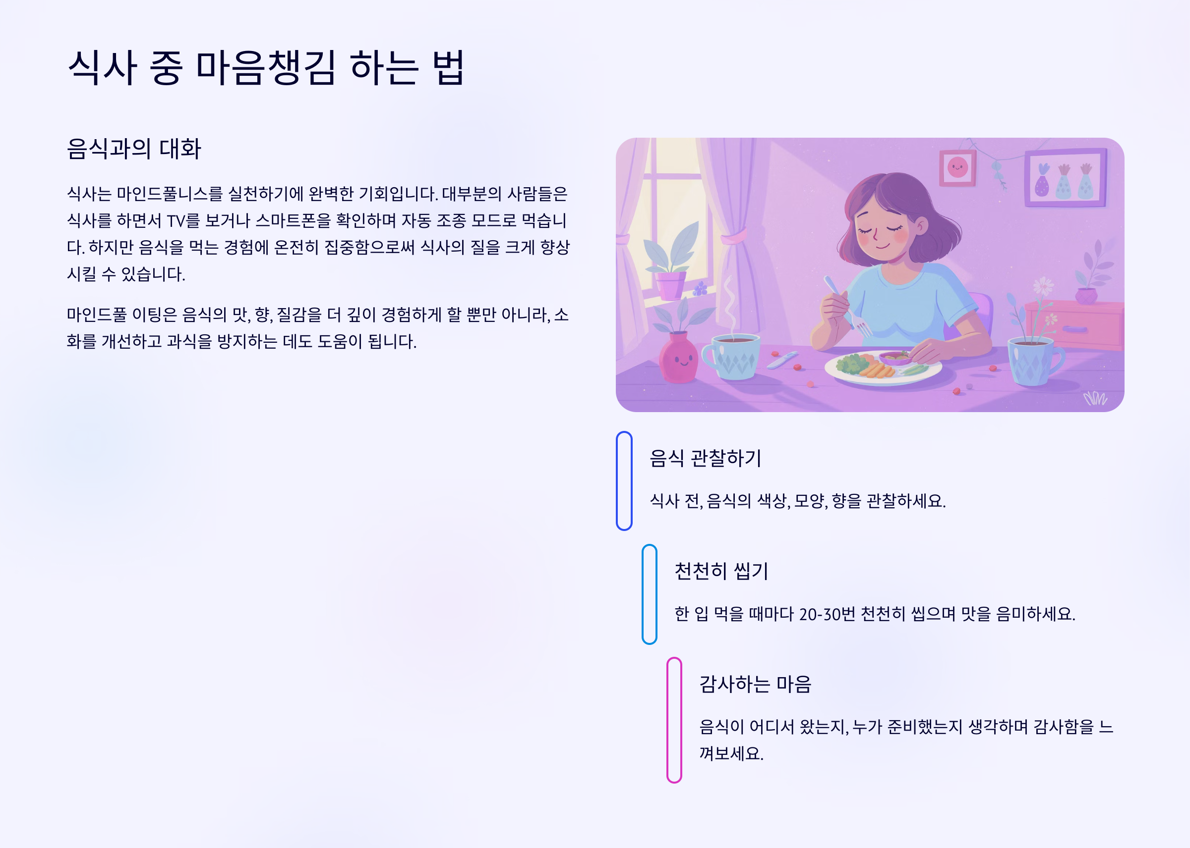 혼자 식사하는 시간이 있다면 특히 더 좋은 기회예요. 식사 자체를 하나의 명상으로 인식해보세요. 단순한 행위도 깊은 집중이 들어가면 삶이 훨씬 충만하게 느껴져요 🌿