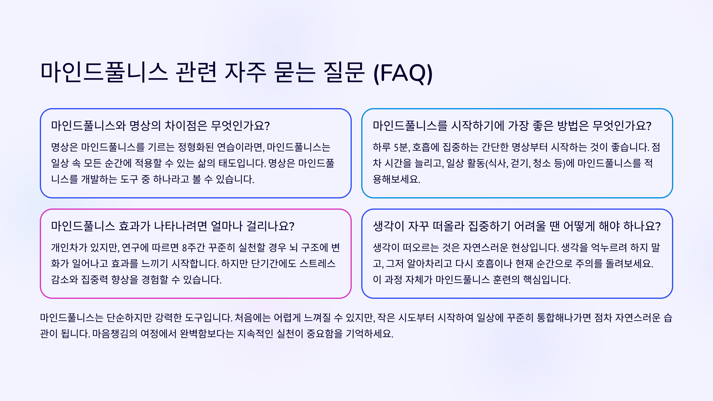 마인드풀니스는 “아무것도 하지 않는 상태”가 아니라, 오히려 더 적극적으로 ‘지금 이 순간’을 살아가는 방식이에요. 명상, 호흡, 일상 행위 그 자체를 의식적으로 실천하는 것이 중요해요.