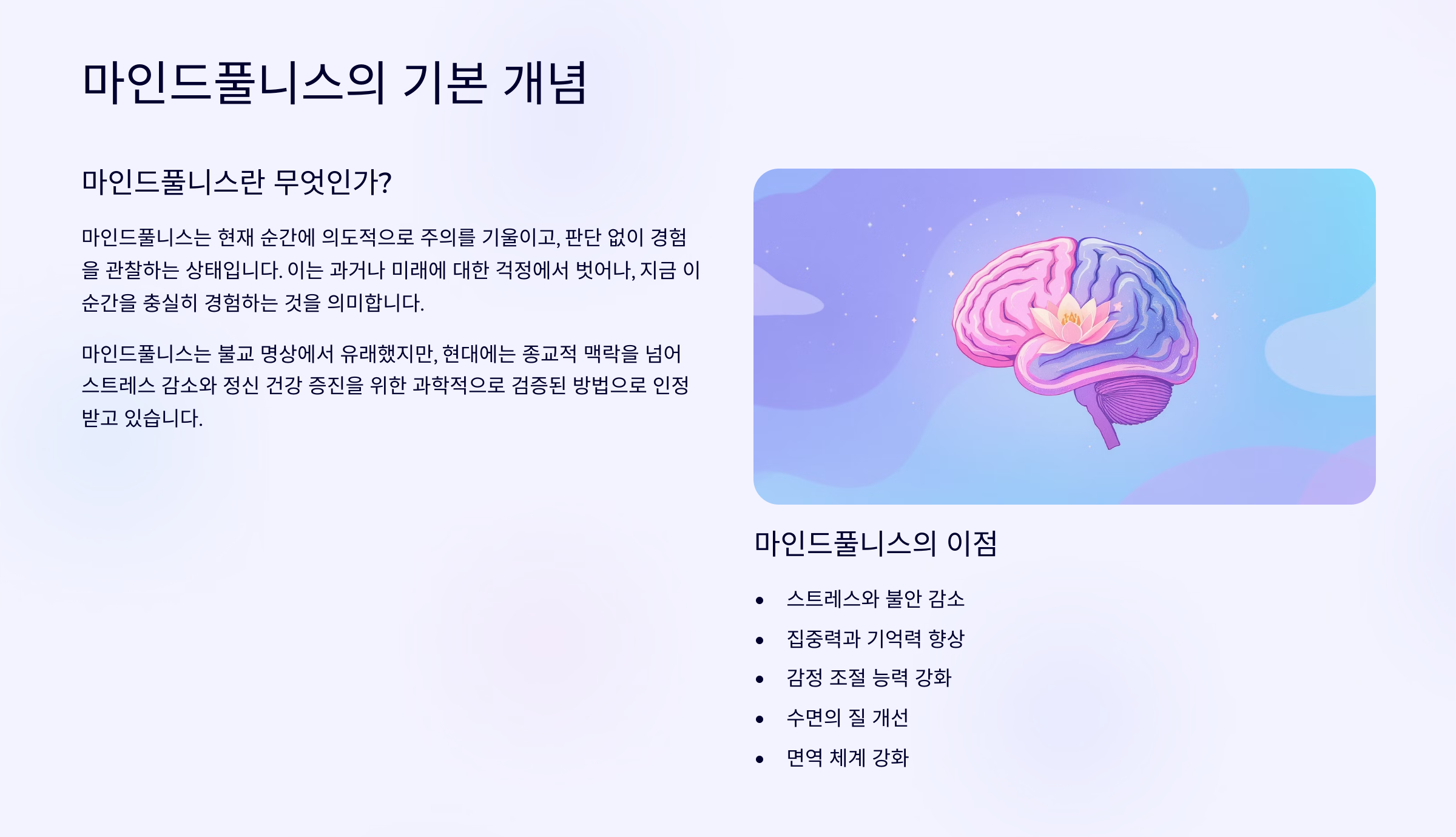 이는 불교 명상에서 유래했지만, 현대 심리학에서는 스트레스 관리, 우울 증상 완화, 집중력 향상 등 다양한 효과로 널리 활용되고 있어요. 특히 정신 건강과 감정 조절을 위한 핵심 기술로 알려져 있답니다.