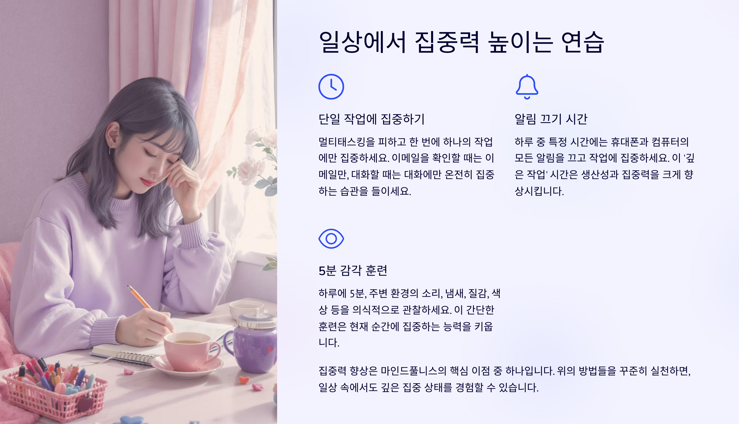 마인드풀니스는 집중력을 향상시키는 훈련이기도 해요. 산만한 환경 속에서도 ‘지금 하고 있는 일’에 온전히 몰입하는 습관이 필요하죠. 이를 위해 가장 먼저 할 수 있는 건 ‘한 번에 한 가지 일만 하기’예요.