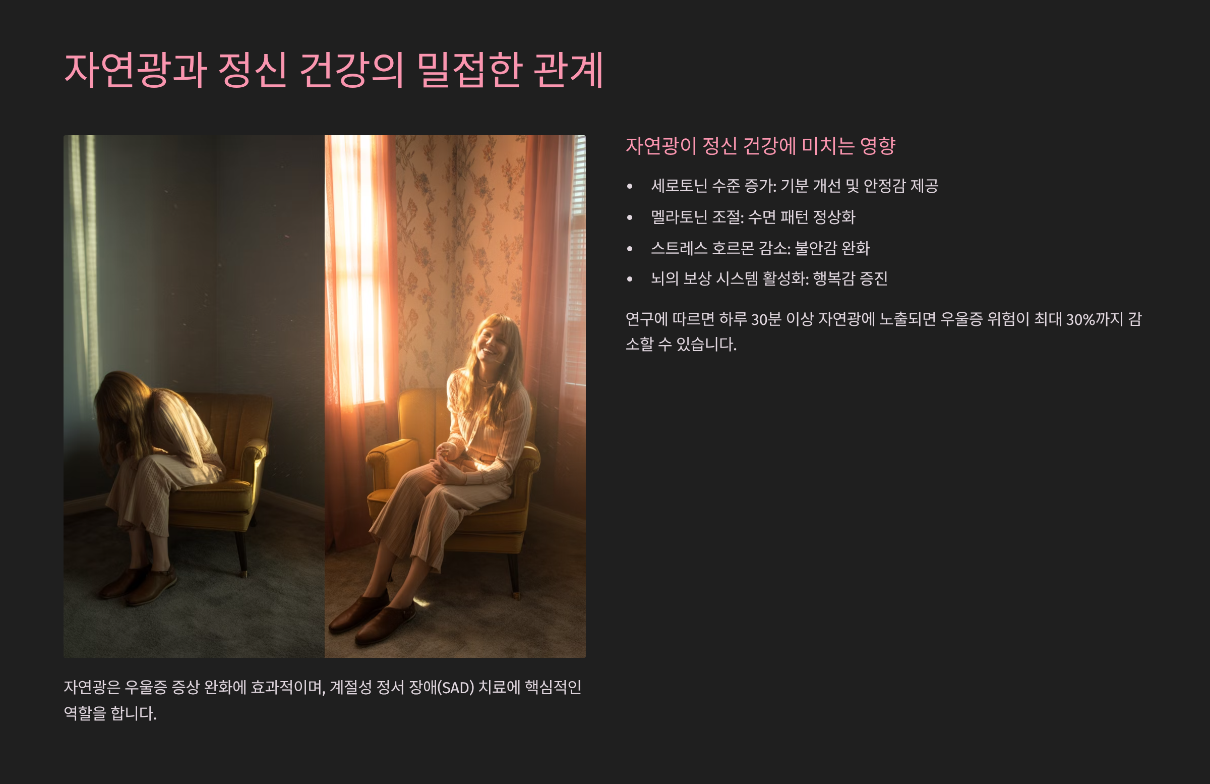자연광은 뇌에서 행복 호르몬이라 불리는 세로토닌의 분비를 촉진해요. 이 호르몬은 우울감, 불안, 스트레스 조절에 큰 역할을 하기 때문에 자연광이 부족한 계절에는 계절성 우울증(SAD)이 나타나기도 해요.