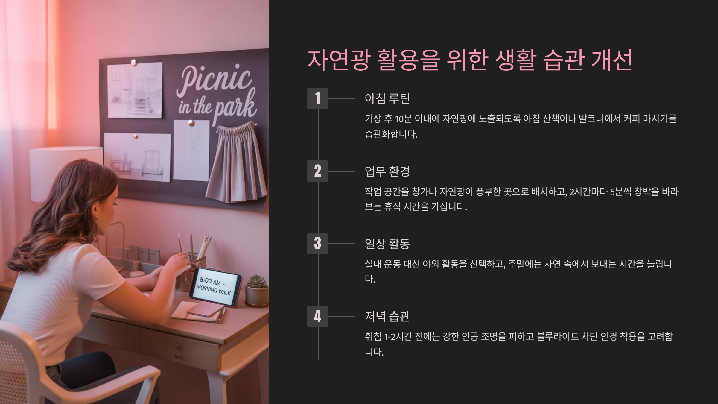 전문가들은 하루 20~30분 정도라도 자연광을 직접 눈으로 보는 것이 중요하다고 말해요. 직사광선이 아니어도 눈에 충분한 빛이 들어오면 생체 리듬이 정상적으로 유지된답니다. 눈으로 들어온 빛은 시신경을 자극해 뇌에 직접 신호를 보내기 때문에 인공조명과는 전혀 다른 효과를 내죠.