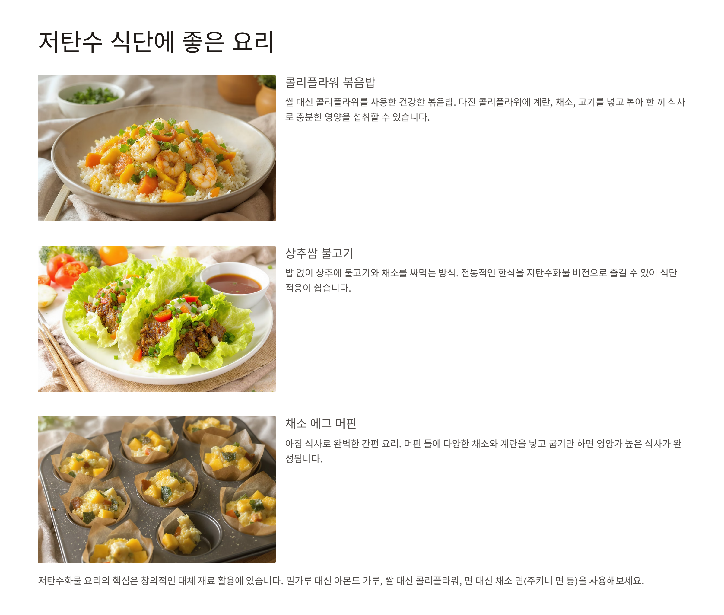 이런 요리는 만드는 법도 간단하고, 도시락이나 간편식으로도 좋아요. 저탄수라고 굶을 필요 없이, 이렇게 실속 있게 먹는 게 진짜 저탄수의 매력이에요 😋