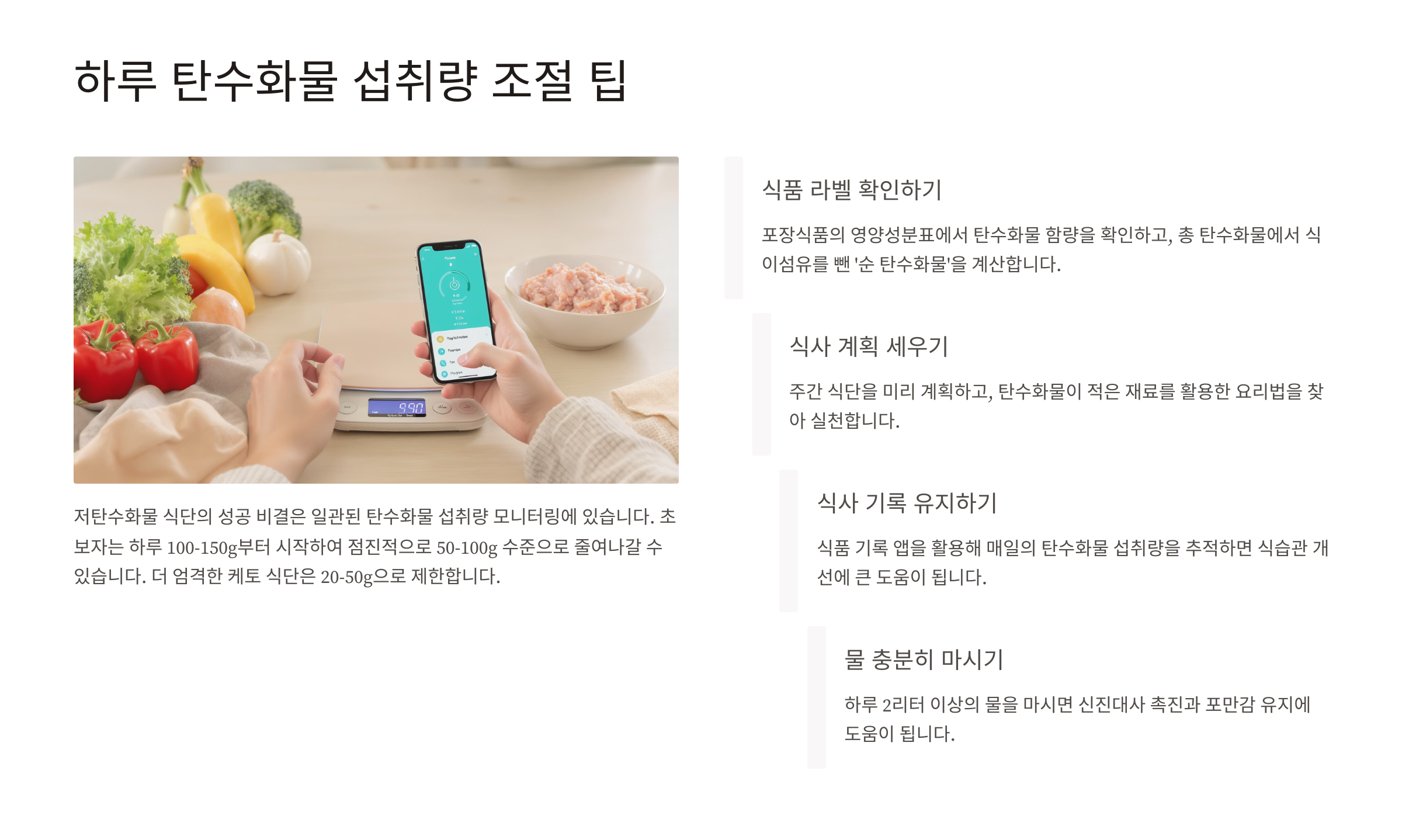 또한, 스마트폰 앱을 활용하면 탄수화물 계산이 훨씬 쉬워요. 칼로리보다 ‘탄수화물(g)’ 단위를 확인하는 습관을 들이면 식단 구성에 훨씬 도움이 된답니다!