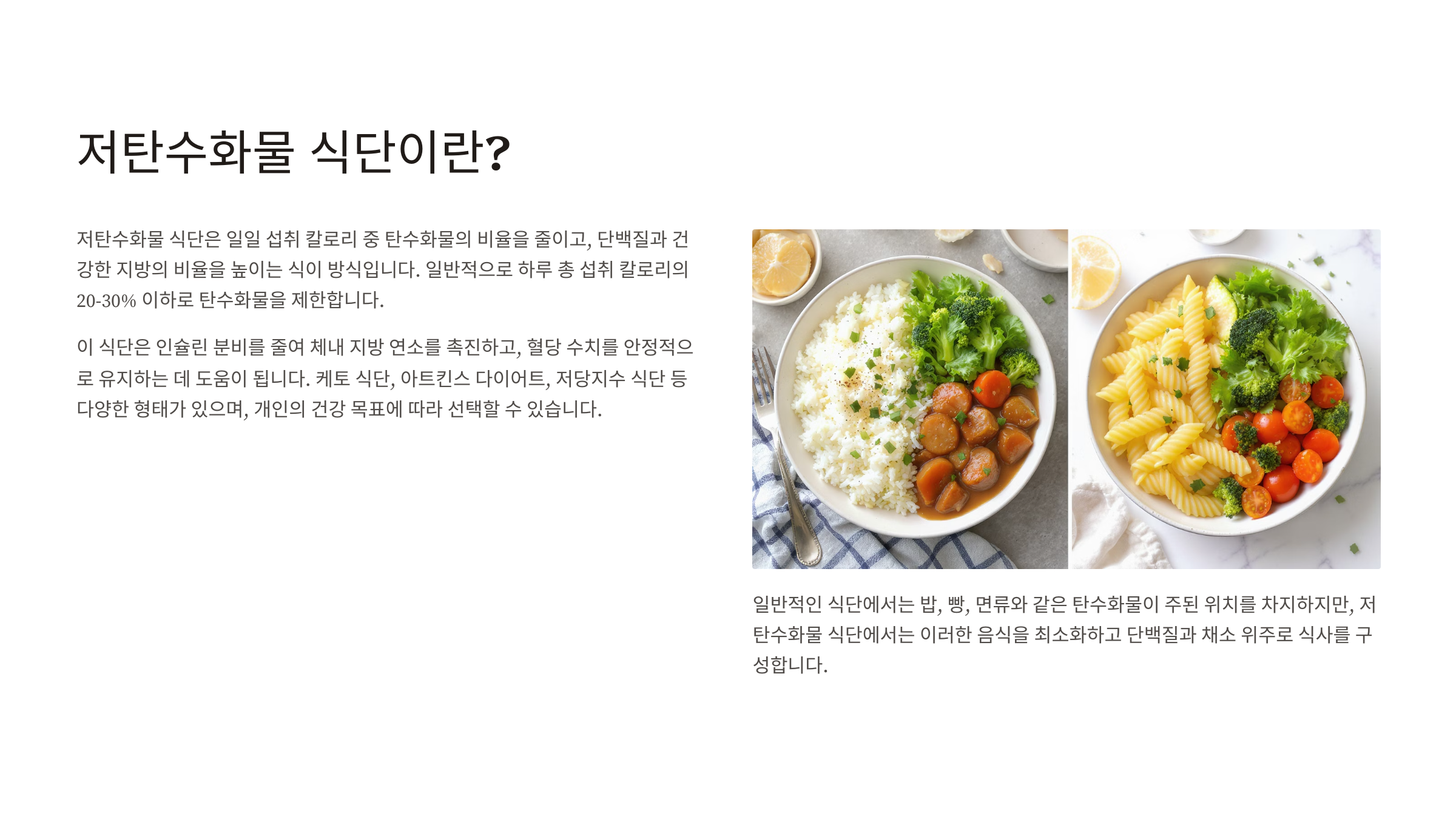 저탄수화물 식단은 말 그대로 하루 섭취하는 총 탄수화물의 양을 줄이고, 단백질과 지방의 비율을 높이는 식사 방식이에요. 우리가 흔히 먹는 밥, 빵, 면, 떡 등의 비율을 줄이면서, 대신 채소, 고기, 생선, 계란, 견과류 등으로 영양을 채우는 거죠.