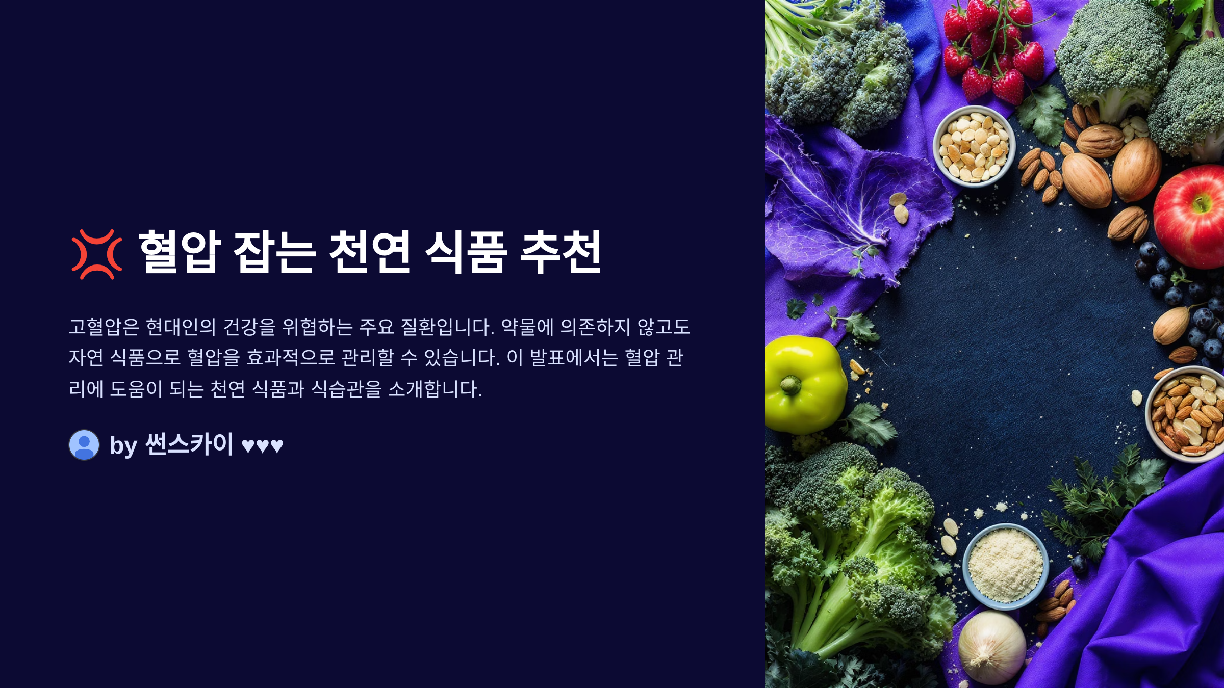 고혈압은 ‘침묵의 살인자’라고 불릴 만큼 무증상으로 진행되기 쉬운 질환이에요. 하지만 조기에 관리만 잘 해주면 충분히 예방하고 조절할 수 있답니다. 그 핵심은 바로 우리가 매일 접하는 음식에 있어요.