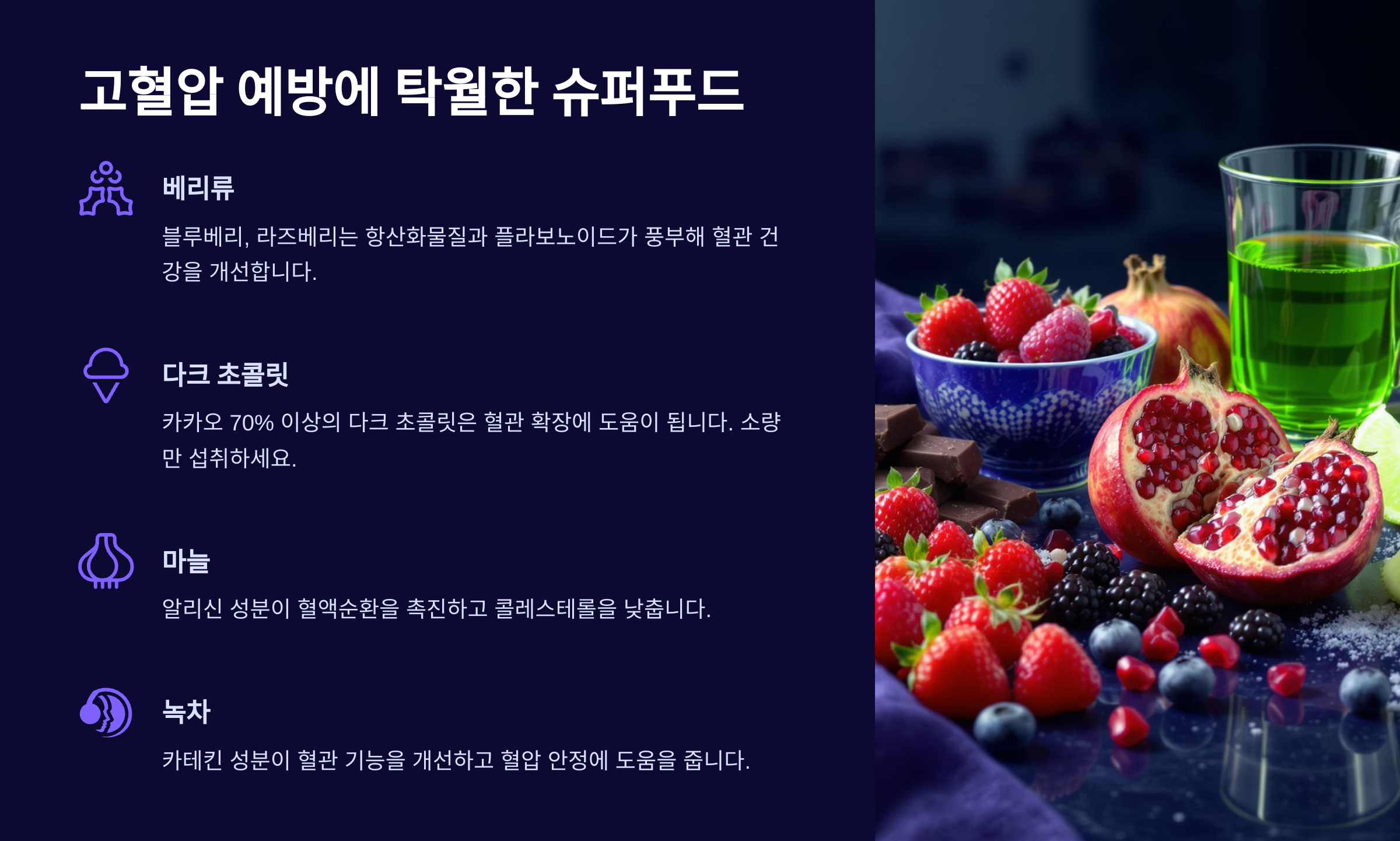 또한, 요즘 주목받고 있는 아보카도도 혈압 관리에 탁월한 식품이에요. 건강한 지방이 풍부하고 칼륨도 많기 때문에 하루에 반 개만 먹어도 충분한 효과를 볼 수 있어요. 과일 중에서는 베리류도 혈관 확장 효과가 크고, 항산화 성분도 많아 고혈압 예방에 추천돼요.