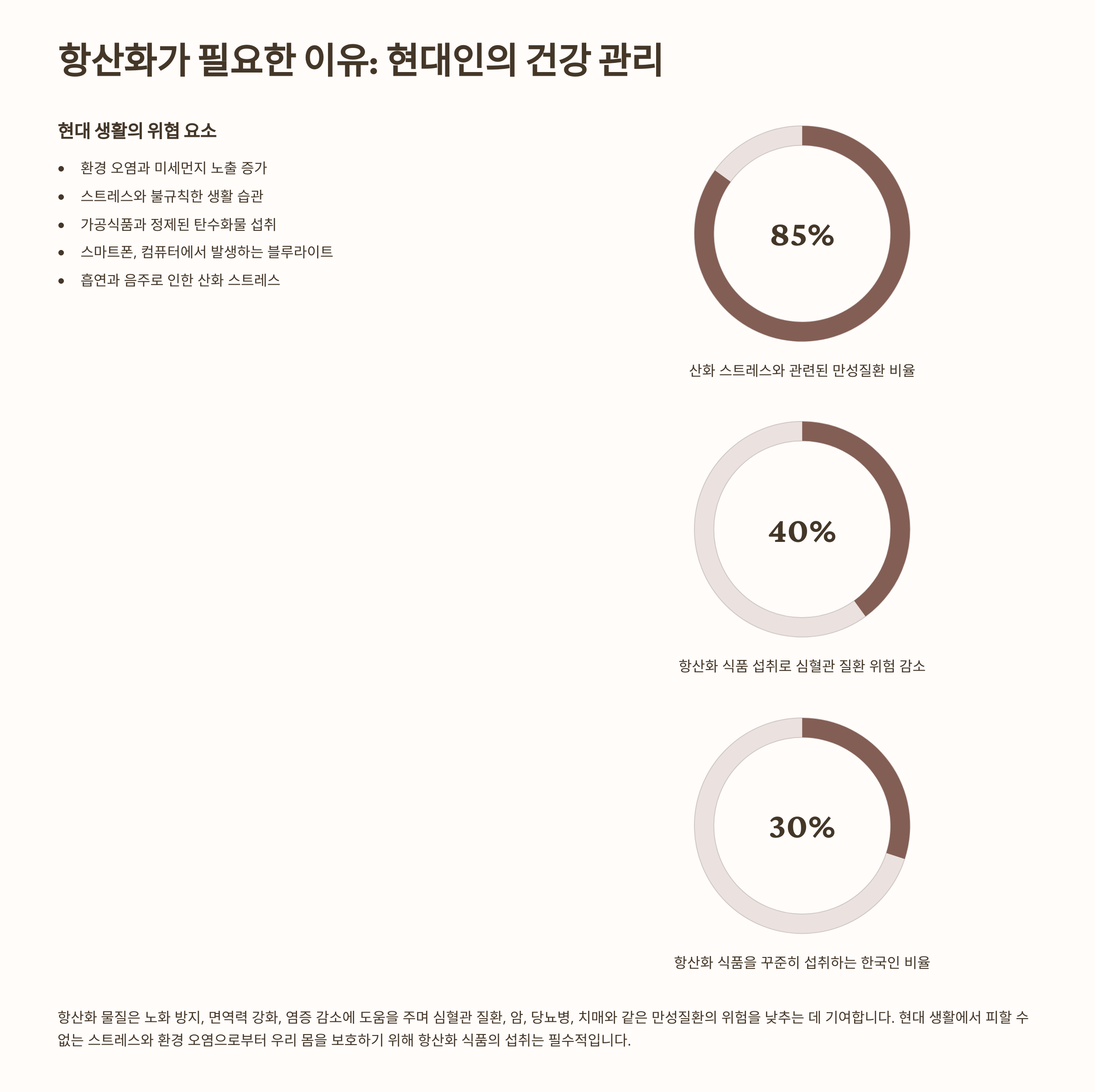 산화 스트레스가 지속되면 세포 노화, 피부 탄력 저하, 기억력 감퇴, 면역력 저하, 그리고 암까지도 유발할 수 있어요. 특히 현대인은 스트레스, 미세먼지, 자외선, 가공식품 같은 환경에 노출돼 있어서 산화 위험이 더 커요.