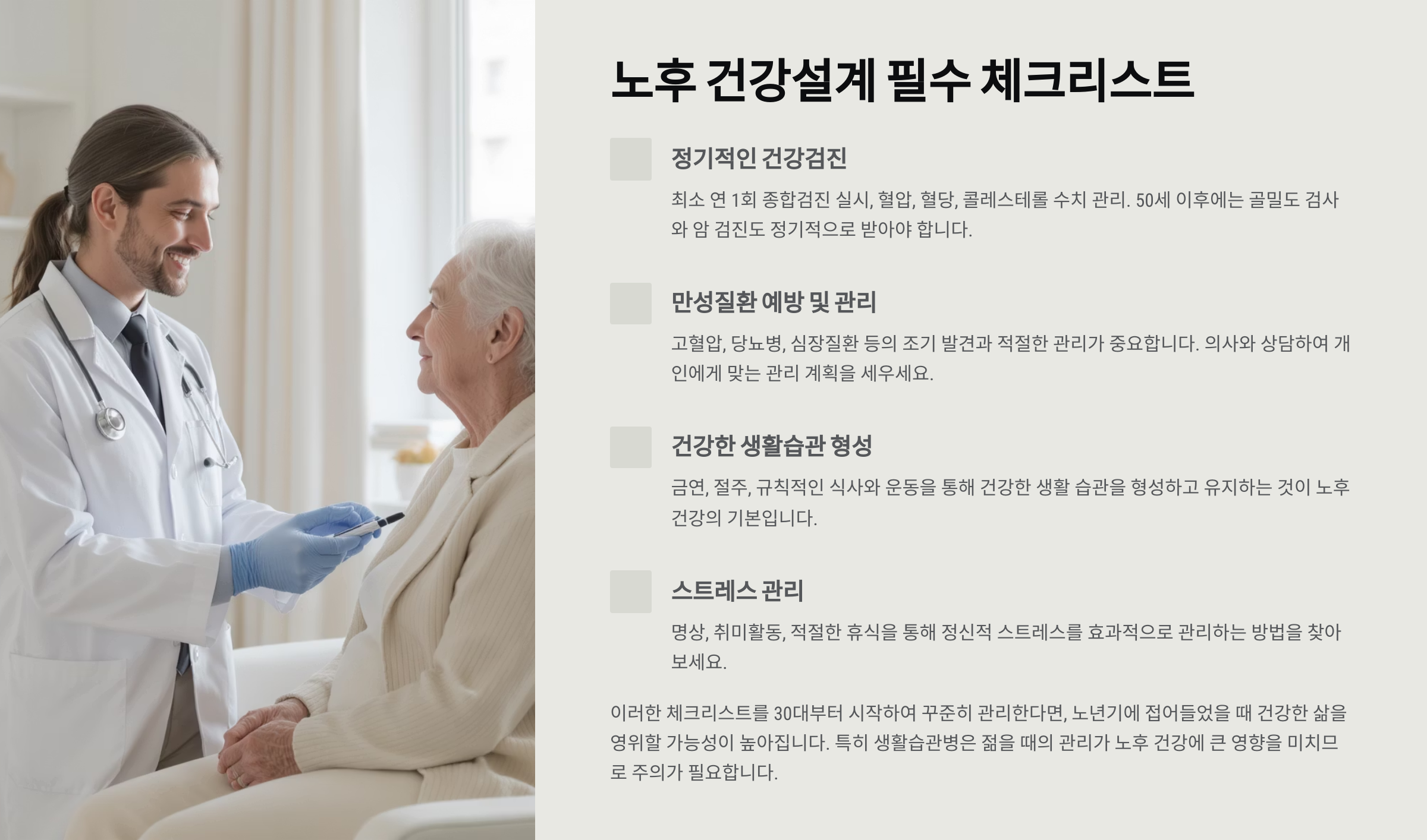 100세 시대가 현실이 된 지금, 오래 사는 것보다 '건강하게 사는 것'이 훨씬 중요해졌어요. 노후를 위한 건강 계획은 단순히 병원에 자주 가는 게 아니라, 평소 생활 습관부터 점검하고 준비하는 것이 핵심이에요.
