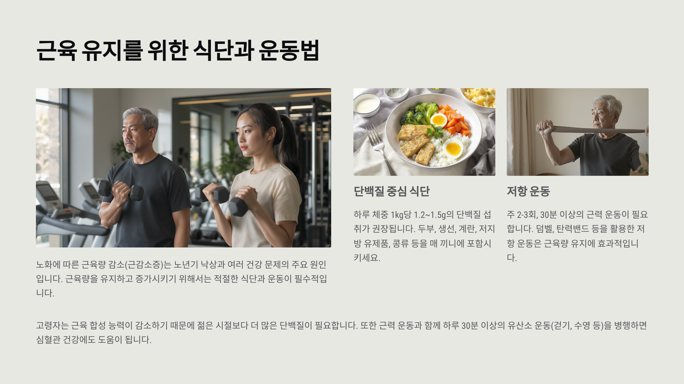 노년기 건강에서 가장 중요한 건 근육이에요. 근육이 줄어들면 낙상, 골절, 당뇨 위험까지 높아지기 때문에 근육을 지키는 식단과 운동은 꼭 병행해야 해요.