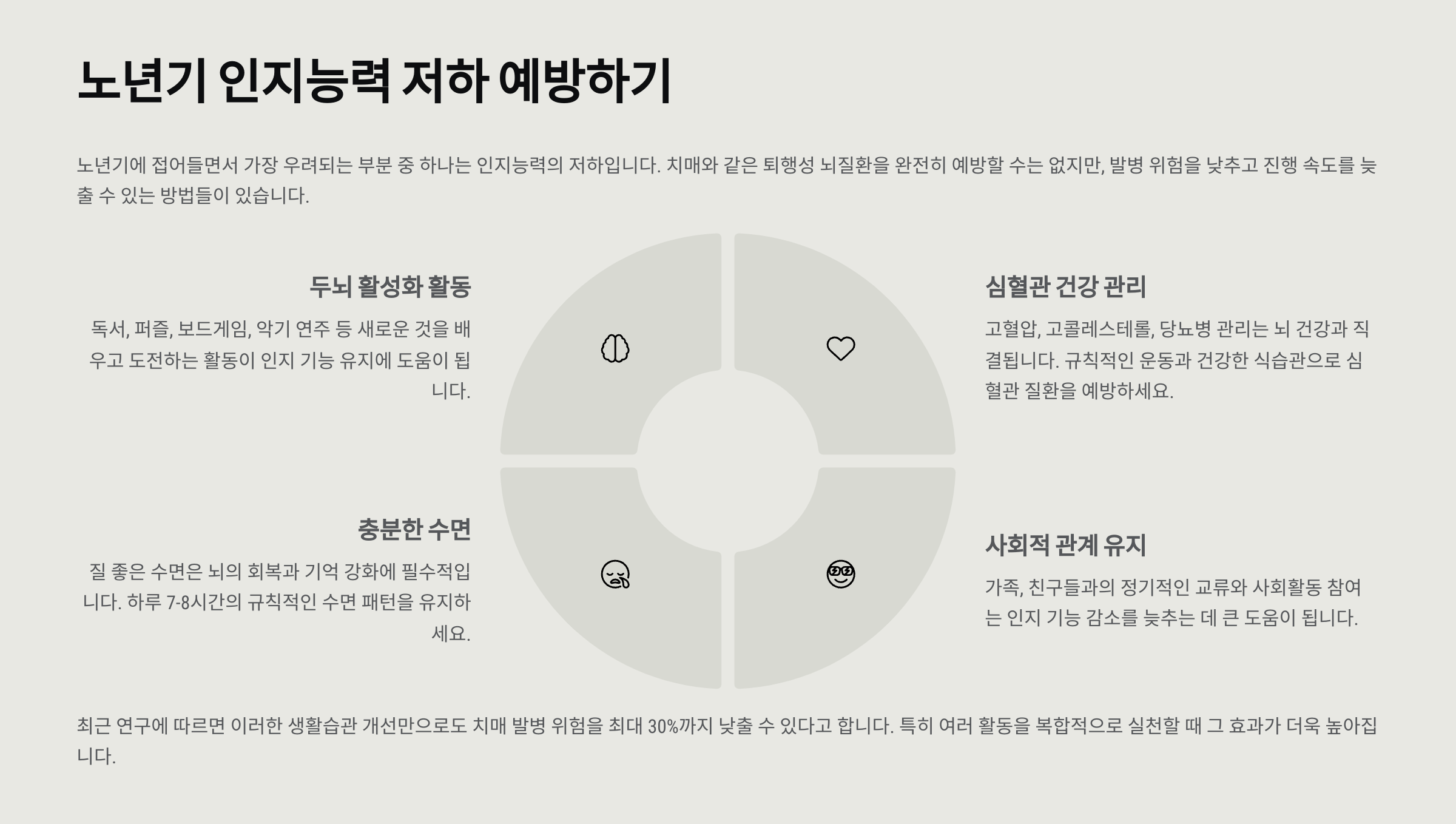 나이가 들수록 자연스러운 변화로 기억력이 조금씩 떨어질 수 있어요. 하지만 그걸 방치하면 치매 위험이 높아질 수 있으니, 미리부터 뇌 건강을 관리하는 게 필요해요.