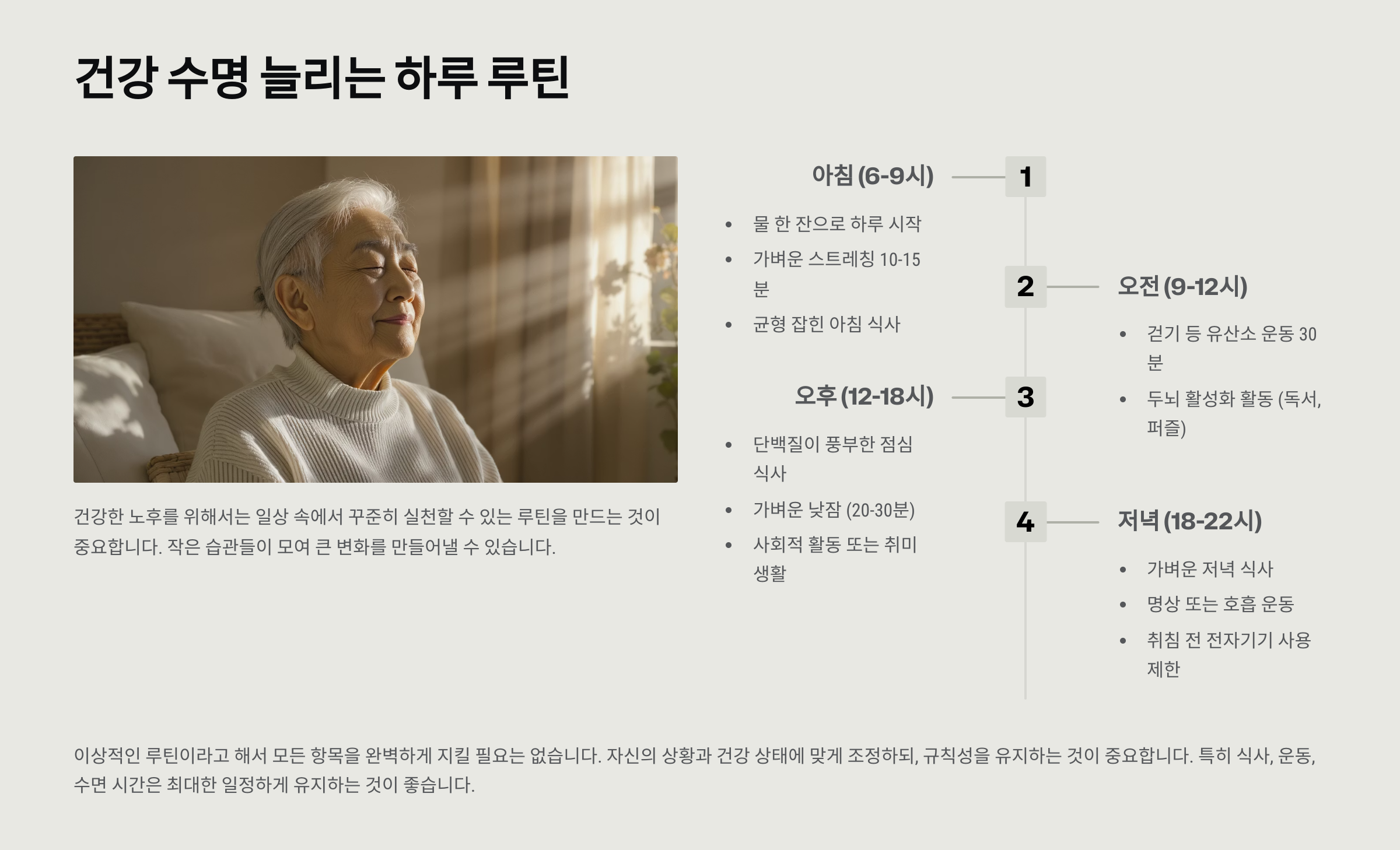 하루를 어떻게 보내느냐에 따라 노후의 건강 수명이 달라져요. 일정한 루틴을 유지하면 생체 리듬이 안정되고 면역력도 높아져요.