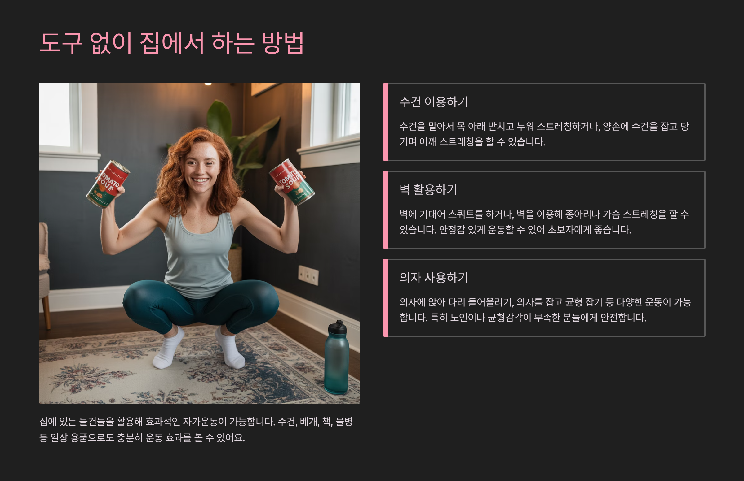 또한 자가운동은 정신적으로도 긍정적인 영향을 줘요. 내 몸을 스스로 관리하고 있다는 자율성과 성취감은 스트레스 완화와 자신감 상승에도 큰 도움이 되거든요. 🧘