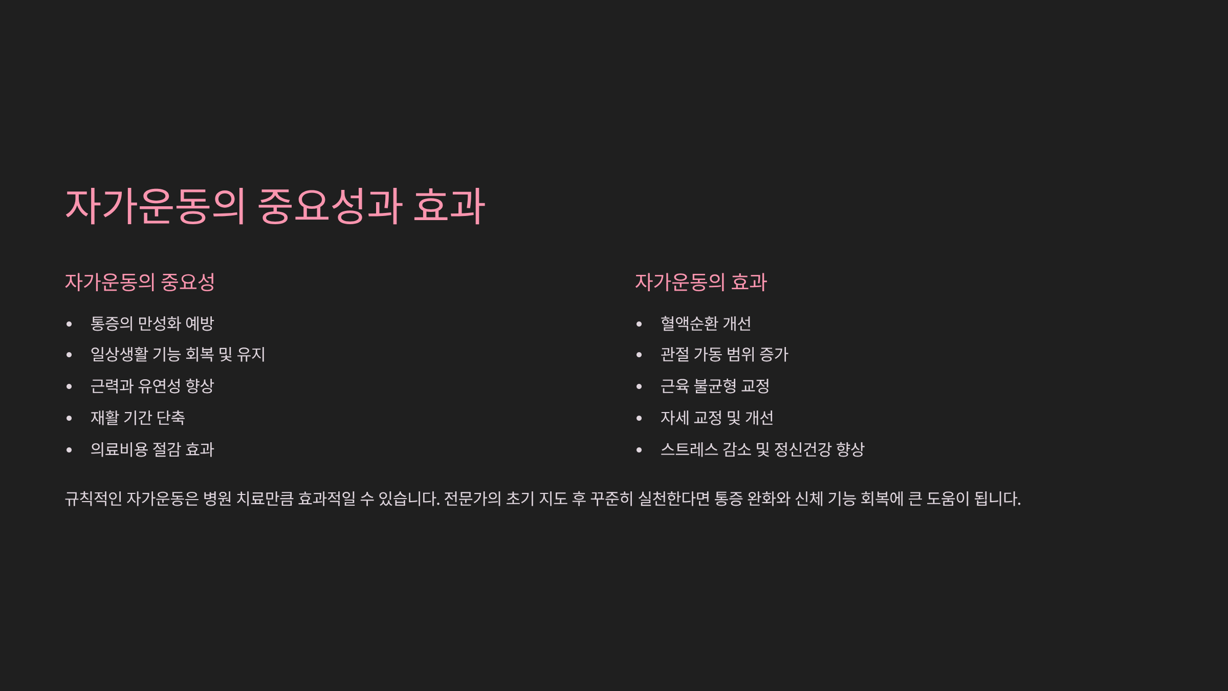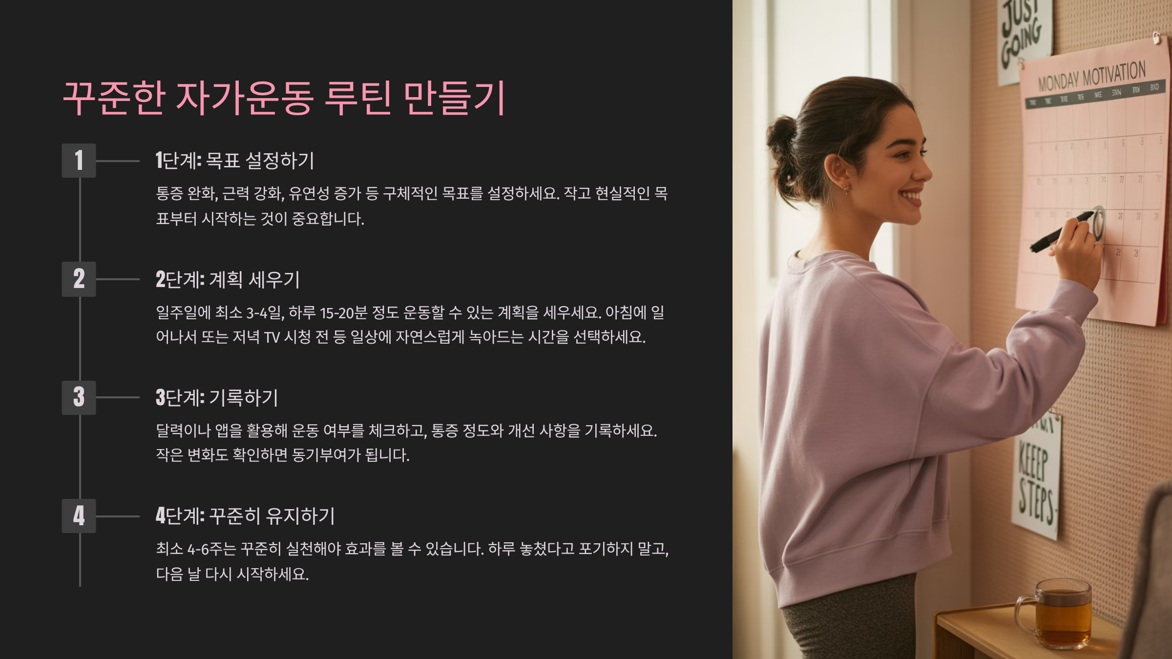 특히 통증 예방이나 회복 속도를 높이기 위해선 자가운동 루틴을 생활화하는 것이 효과적이에요. 비용 부담 없이 집에서도 쉽게 실천할 수 있어 누구에게나 유익하답니다.